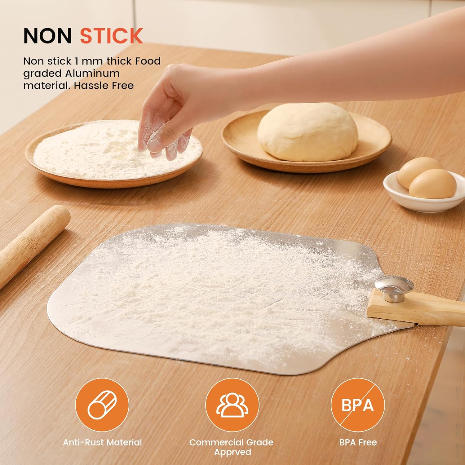 【Easy to Use】: In contrast to wooden pizza peel boards that splinter and aren’t moisture-resistant, our rust-resistant aluminum pizza peel is the ideal solution. Lightweight and ultra-thin, just add a bit of cornmeal to the metal surface, and your pizza slides effortlessly from the pizza scraper straight onto your plate.