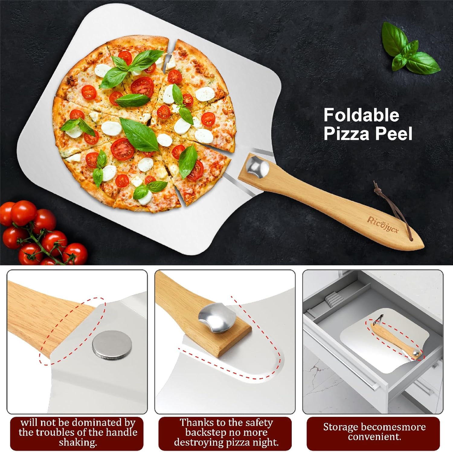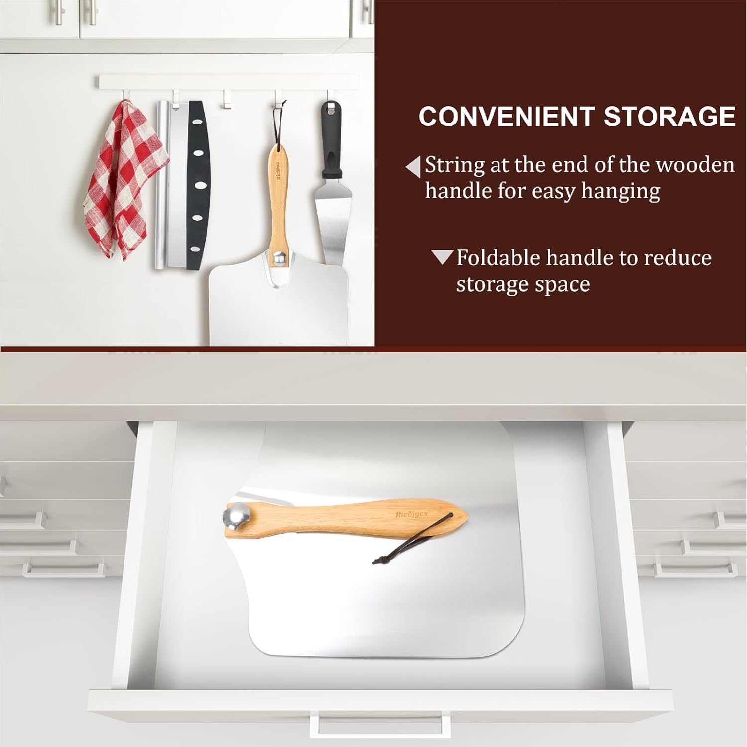 【Easy to Store, Easy to Clean】The wooden handle has a cord at the end, the tail of the cutter and spatula also have a hole, all perfect for easy hanging storage. And the wooden handle foldable design is very easy to store and can fit into any size kitchen. When the aluminum pizza peel needs to be cleaned, simply remove the wooden handle and wipe it down, hand wash the pizza board with a soft sponge for cleaning.