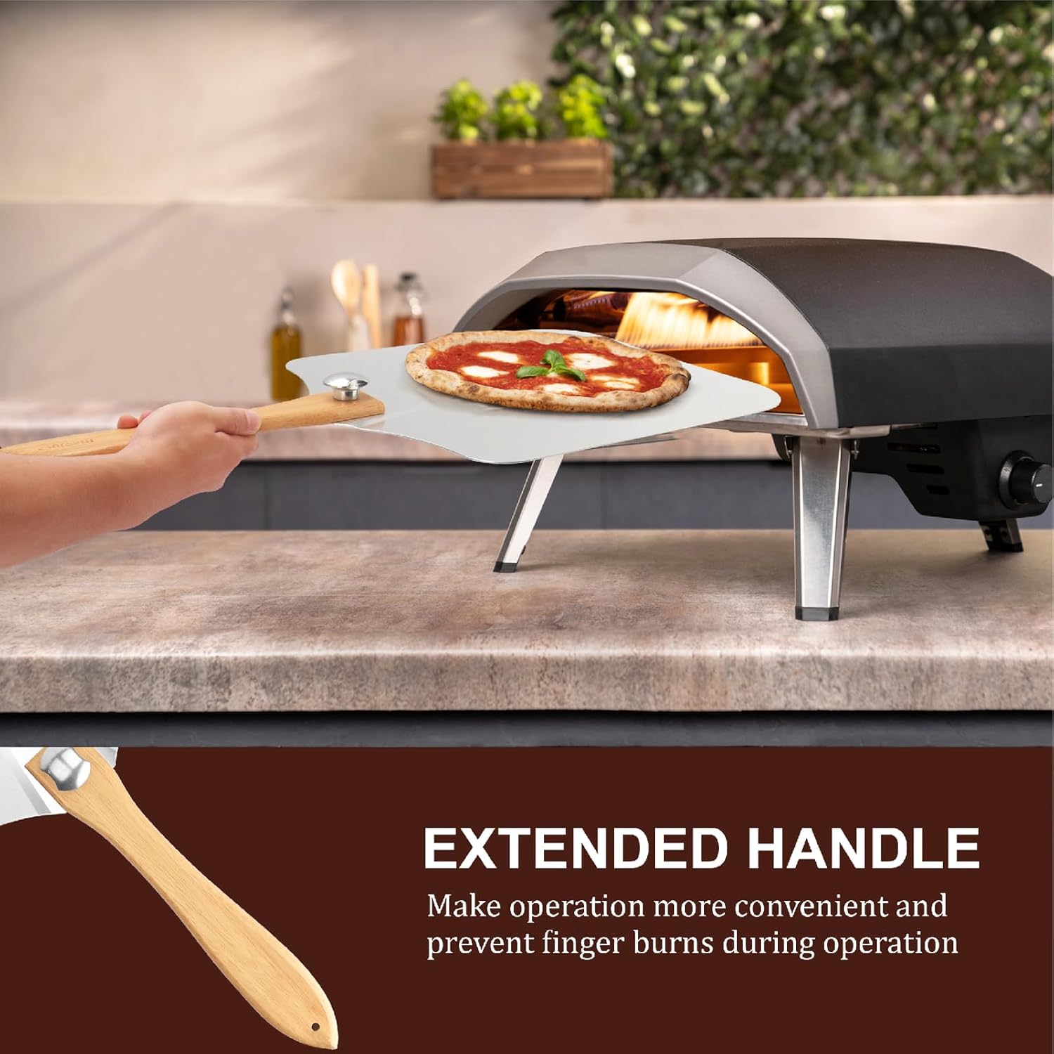 【Premium Quality and Durable】The pizza shovel is made of high quality aluminum which makes it sturdy and durable. It can easily withstand the full weight of your pizza without deformation.With a smooth surface and a sprinkle of cornmeal, our pizza pie will effortlessly glide off the peel and into the pizza oven. And the wooden handle offers comfortable grip, avoid heat transfer, prevent burns.