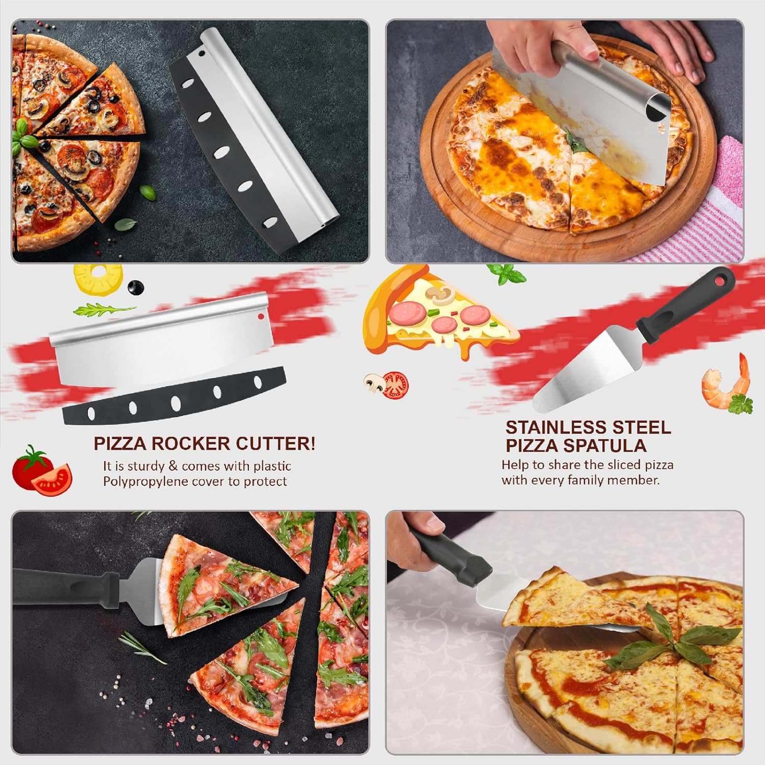 【Professional Alumium Pizza Cutter】The pizza paddle contain a 14 inch pizza Peel, a Pizza Spatula and a 14 inch Pizza Rocker Cutter with cover. The pizza rocker cutter with a sharp rocker blade witch is rocked back and forth to cut the pizza in perfect slices.