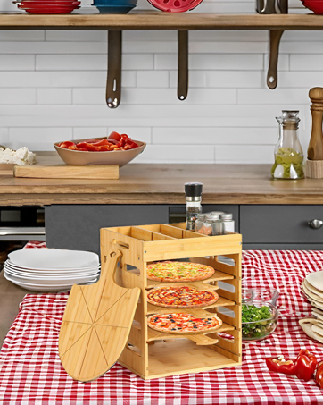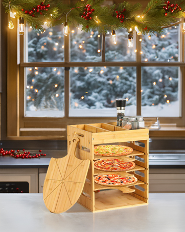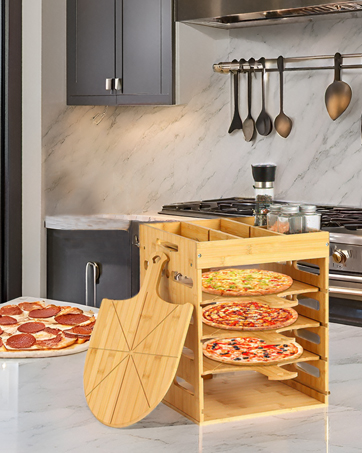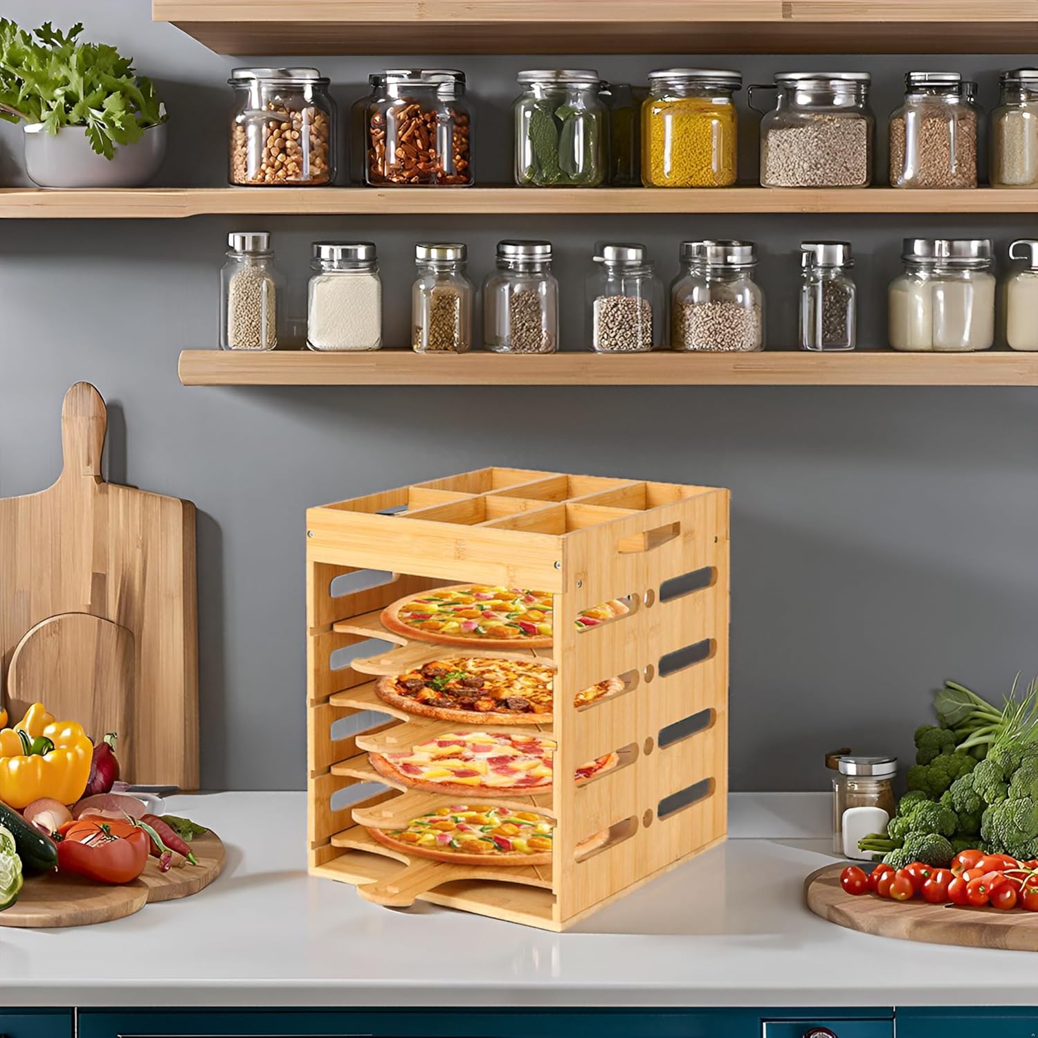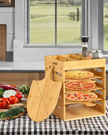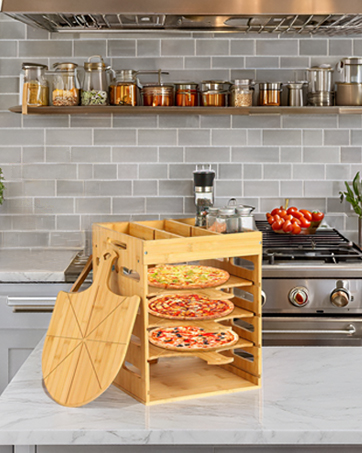 Versatile Top Storage Divider Pizza Rack Stand: The top of the pizza rack features a convenient storage divider for organizing condiments, utensils, napkins, or extra toppings. Customize layout to accommodate items for a tidy, functional space