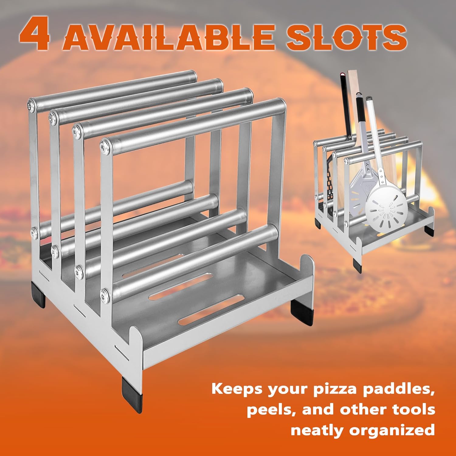 【Fits Various Sizes】Capable of holding a pizza peel from 6-12 inches, this rack features four spacious slots, effortlessly accommodating a range of pizza peel sizes. Whether it is using for preparing a small personal pizza or a large family-sized pie, this rack has all covered. Comes with all assembly hardwares, will only take 5-mins for easy assembly.