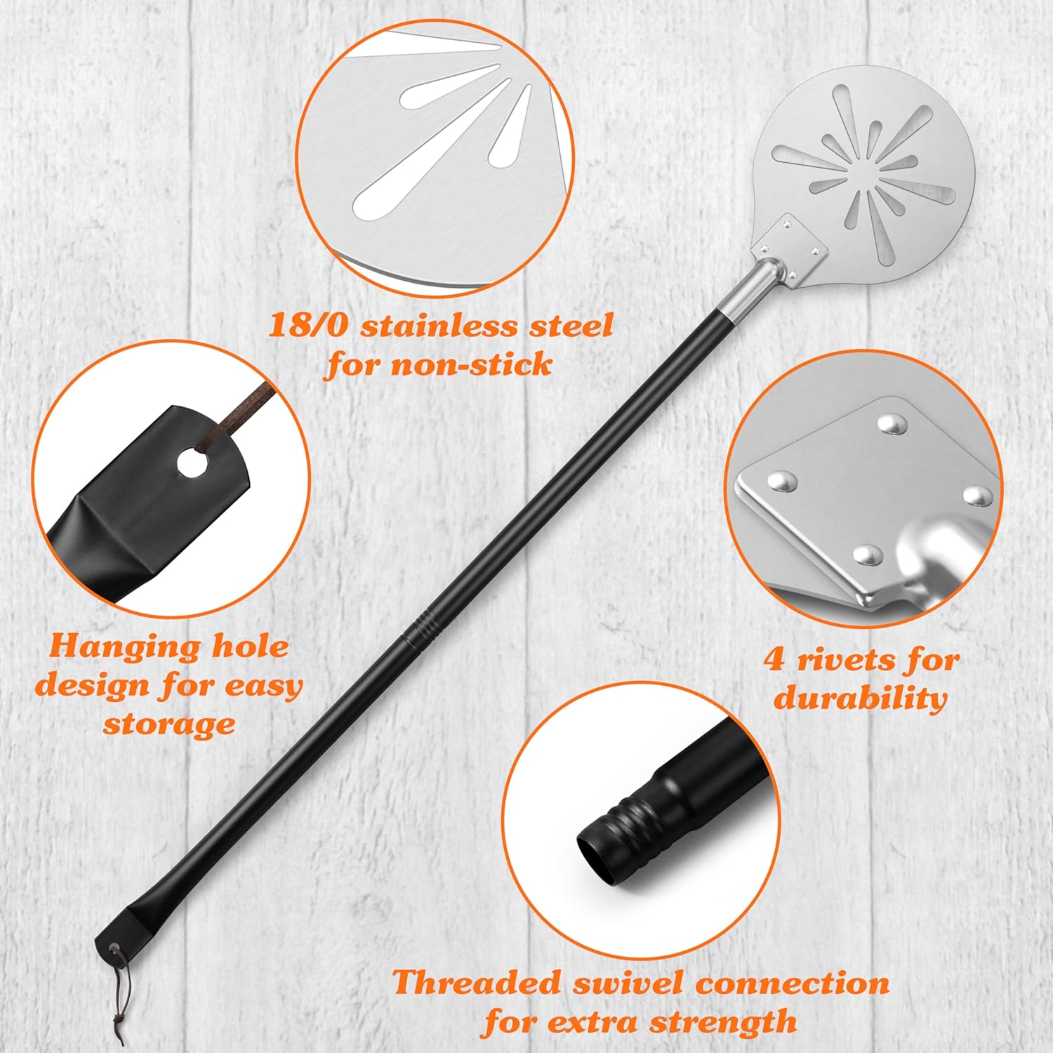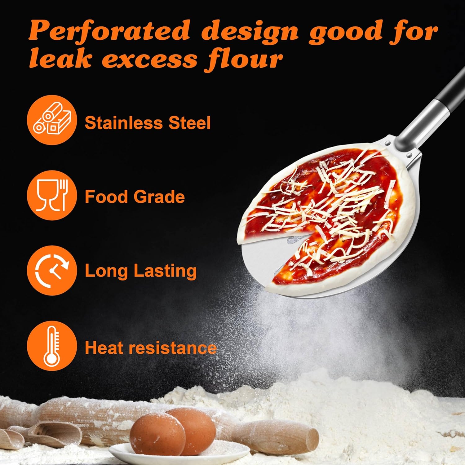 Unique Design with Holes: Teardrop-shaped holes can effectively leak off excess flour during transferring pizza, avoiding the accumulation of flour on the bottom of pizza, making pizza more crispy and the bottom will not become wet and soft due to too much flour, Pizza turning peel handle is fixed by the thread rotation on the steel tube, stronger than the traditional riveting process and reduces the problem of handle loosening