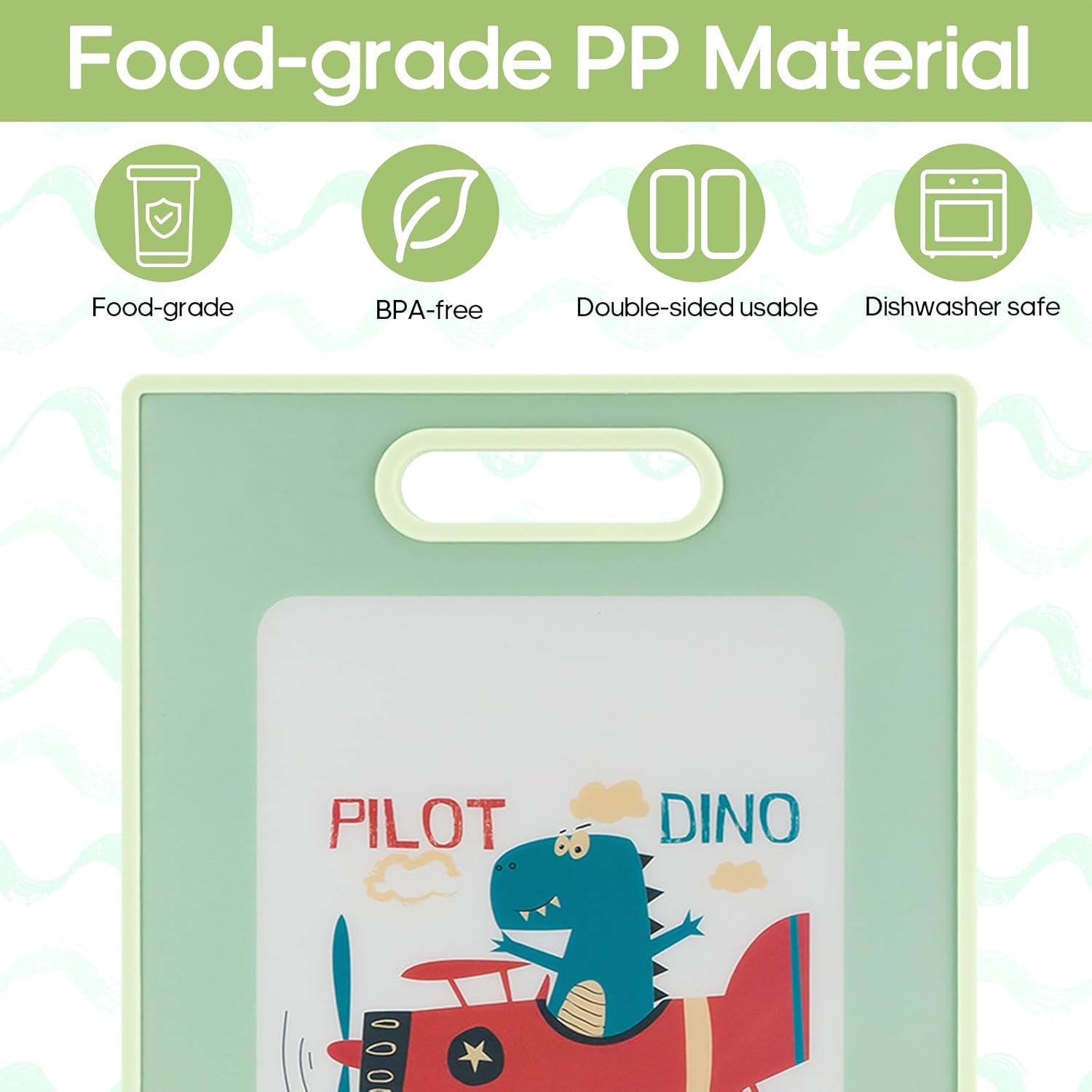 The cutting board is double sided for use, one side comes with a cute dinosaur pattern and the other side is a solid color that can be sorted for different ingredients.