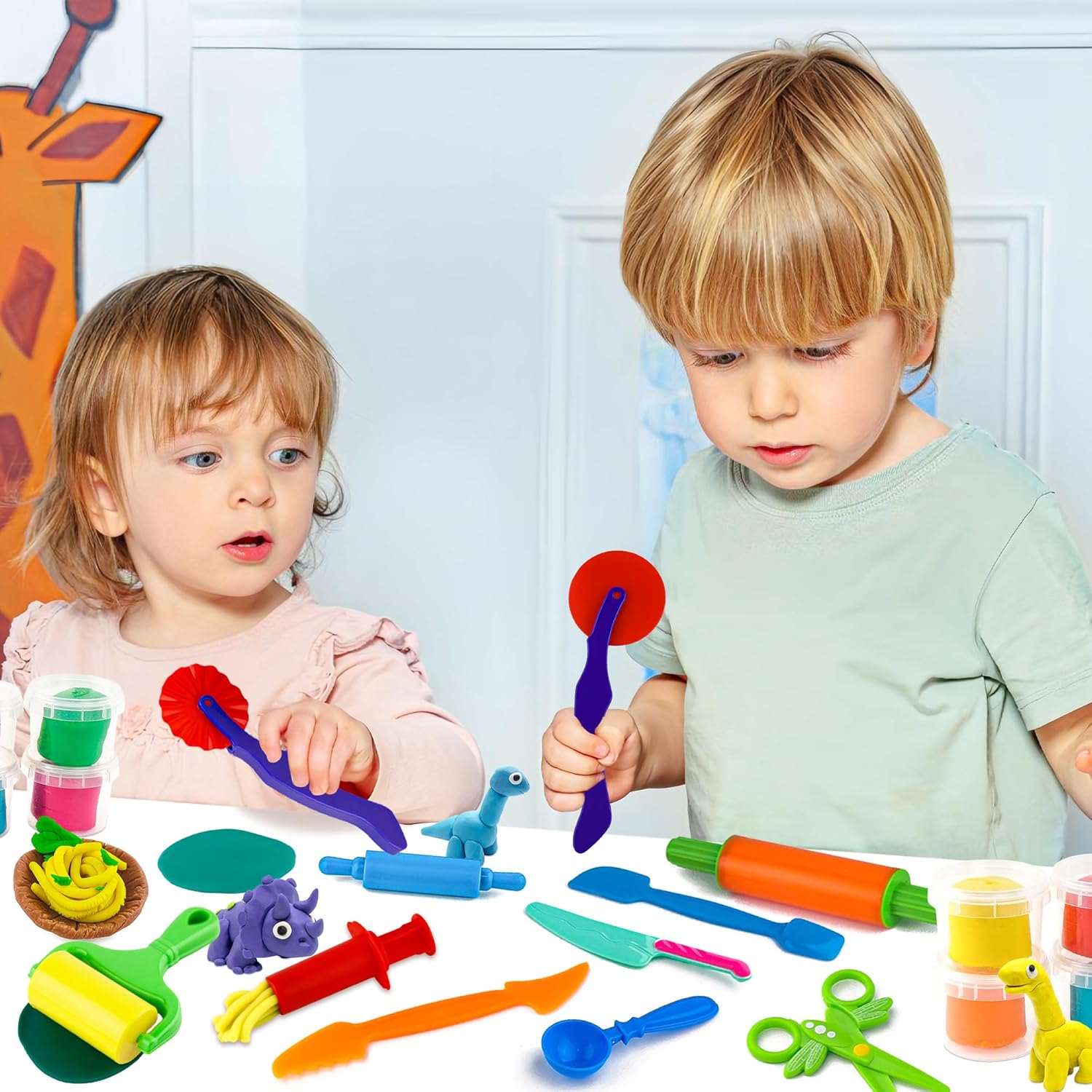 11 PCS Playdough Starter Set: The package includes pizza straight cutter *1, serrated edge pizza cutter *1, large rolling pin *1, small rolling pin *1, safety scissors *1, plastic knife *1, playdough roller *1, double-sided decorating tool *2, spoon *1 and dough extruder *1. Tips: Only tools, no clay included