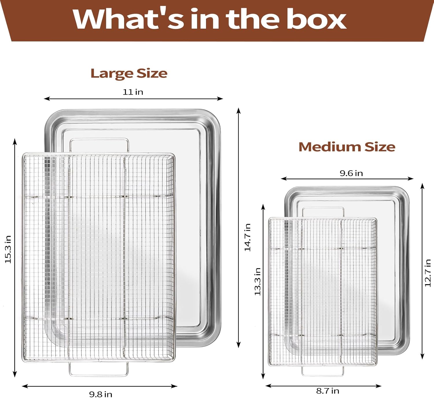 【Dual-Size Set Perfect for Family Meals & Entertaining】This oven air fryer basket and tray set includes two versatile sizes (Medium: 13.3″x8.7″ basket, 12.7″x9.6″ tray; Large: 15.3″x9.8″ basket, 14.7″x11″ tray), fitting most ovens with air fry functions. Cook multiple dishes simultaneously—use the air fryer basket for oven to crisp fries while the air fryer tray for oven roasts veggies. The racks also double as cooling stands for baked goods or extra baking space!