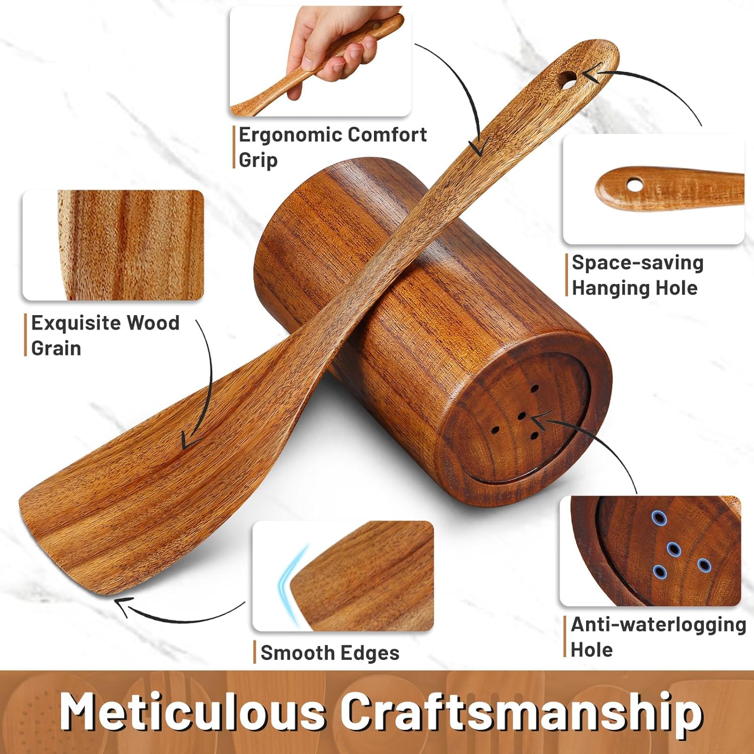 【Easy to Clean & Store】Cleaning is a breeze—simply wash with warm water or soapy water, and let the wooden cooking utensils set air dry when hung in your kitchen. All cooking utensils feature a small hole in the handle for convenient hanging or storing in the cooking utensils holder.