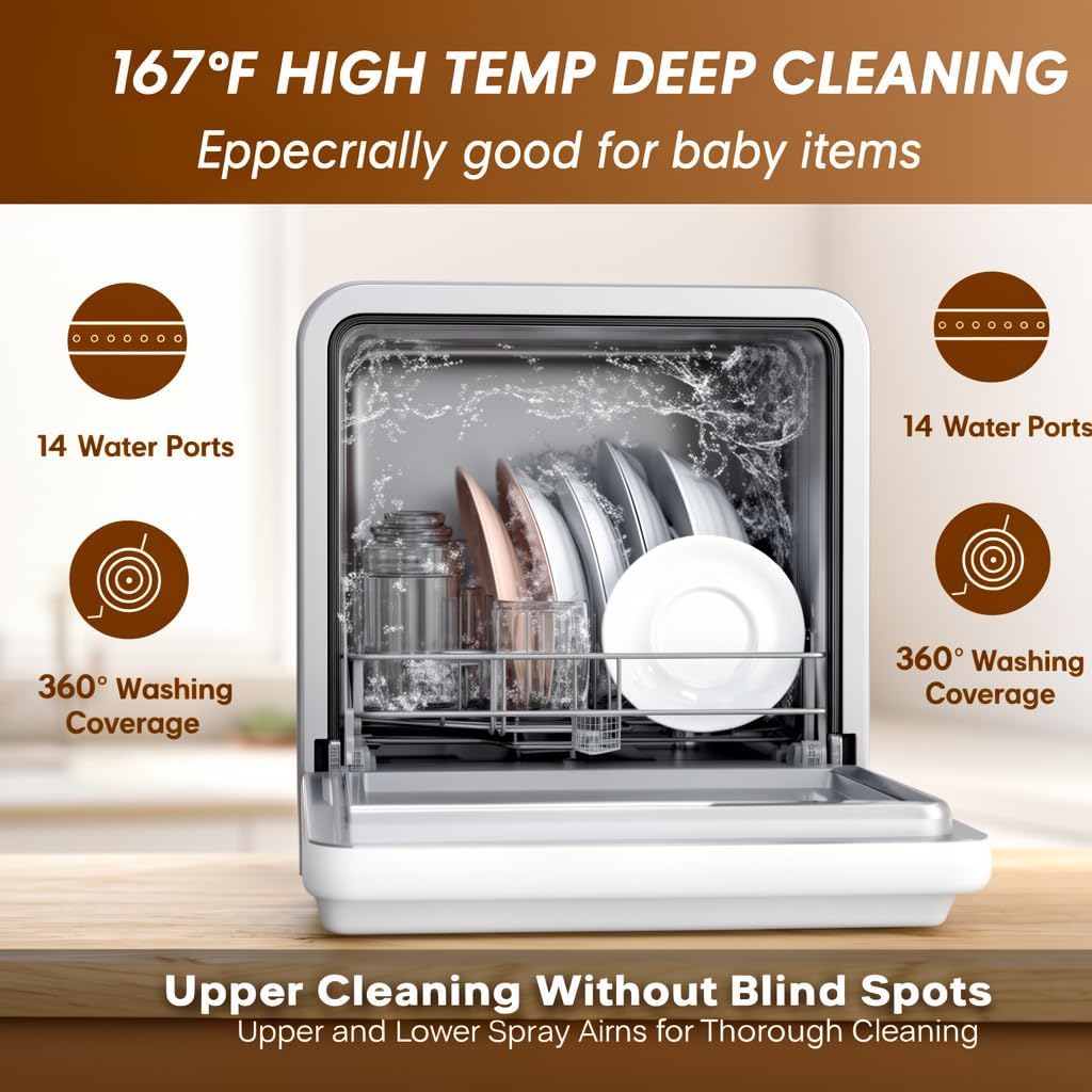 【Compact Size, Surprisingly Large Capacity】Despite its space-saving footprint, this countertop dishwasher holds a generous load—easily managing everyday dishes for a family of 3–4. Its optimized interior layout fits plates up to 12 inches (angled placement recommended) along with bowls, cups, and cutlery, offering efficient cleaning in a mini form. Measuring 17.9 × 16.3 × 16.5 inches, it takes up minimal counter space, making it a smart choice for small kitchens, apartments, dorms, RVs, and camper living.