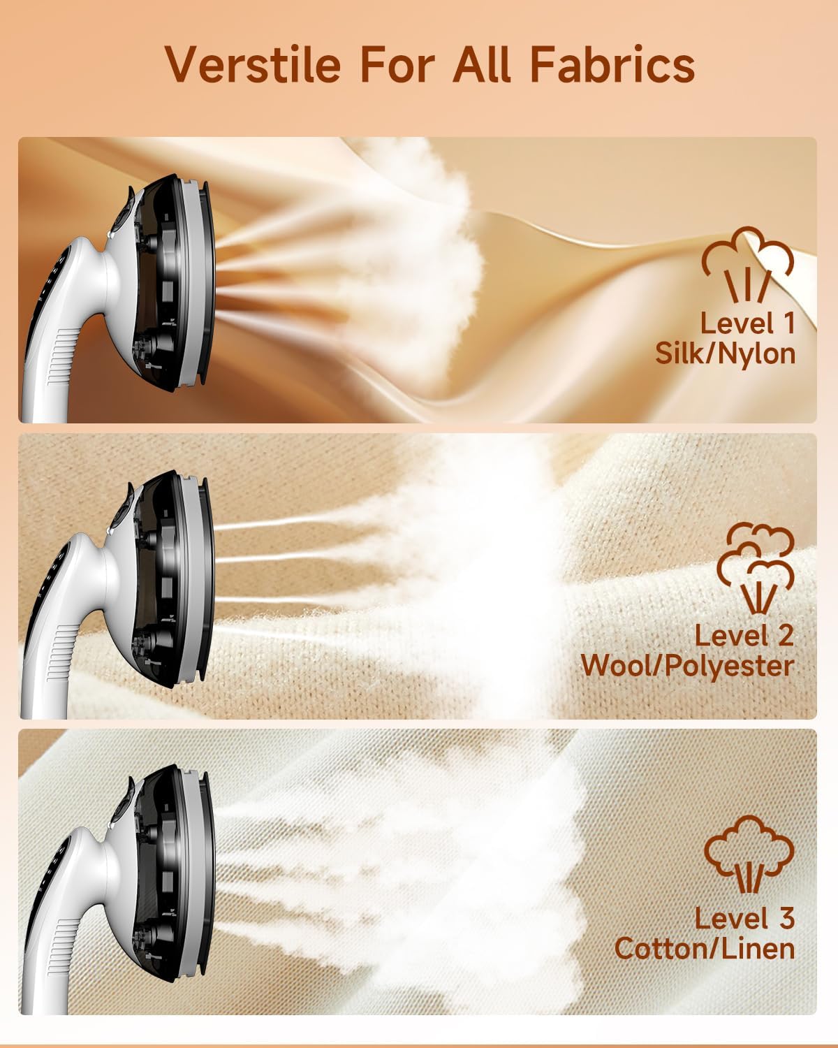 ✅ 3-ADJUSTABLE STEAM: With three adjustable steams, this steam iron is verstile for all fabrics: Low steam for Silk, Nylon, and Delicates fabrics; Medium steam for Wool and Polyester fabrics; High steam for Cotton, Linen, and Denim fabrics.