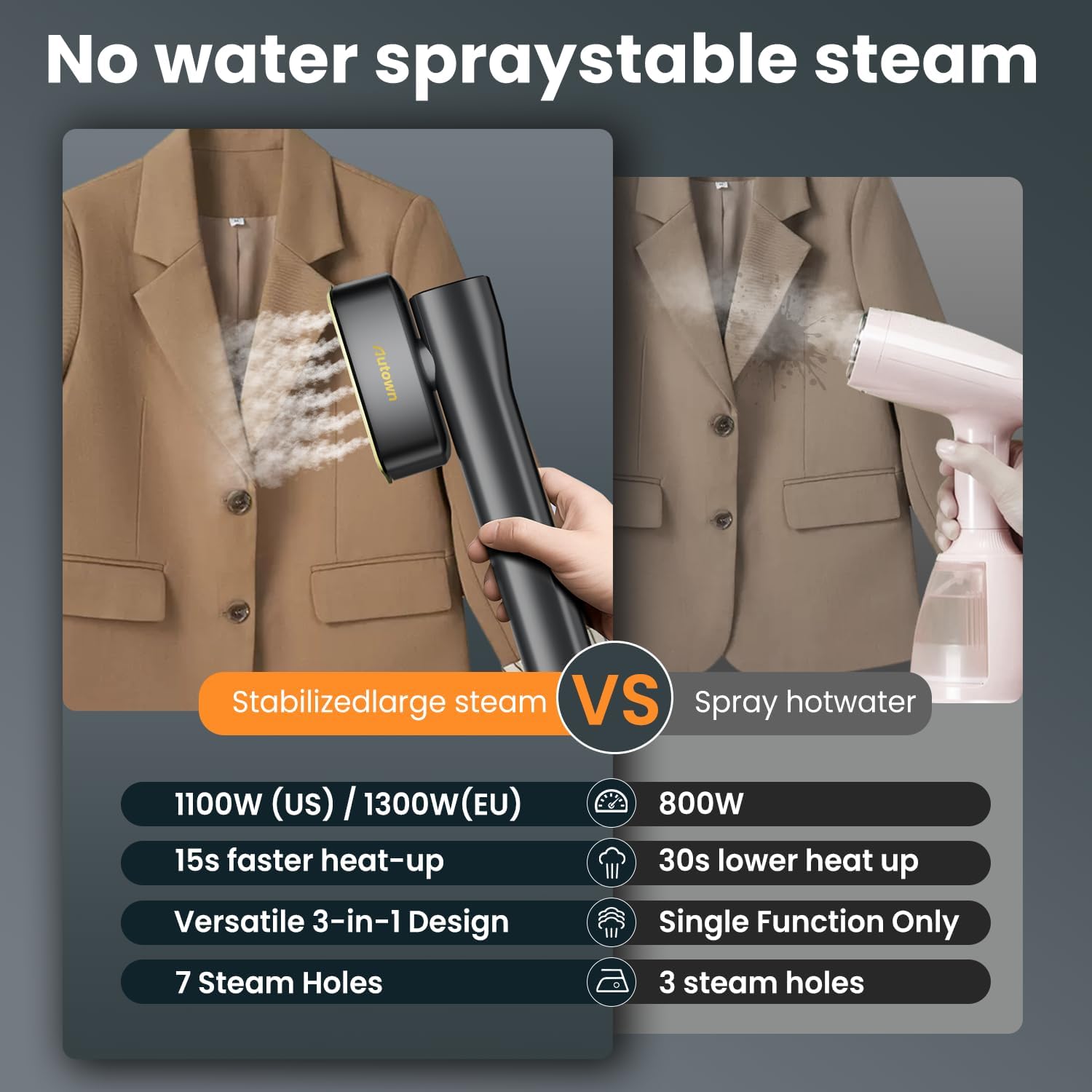 Powerful Wrinkle Removal – Autown 1100W portable garment steamer heats to 320–350°F and delivers steady steam for fast results. The upgraded 3-layer heating panel spreads steam evenly to smooth wrinkles on both delicate and heavy fabrics.