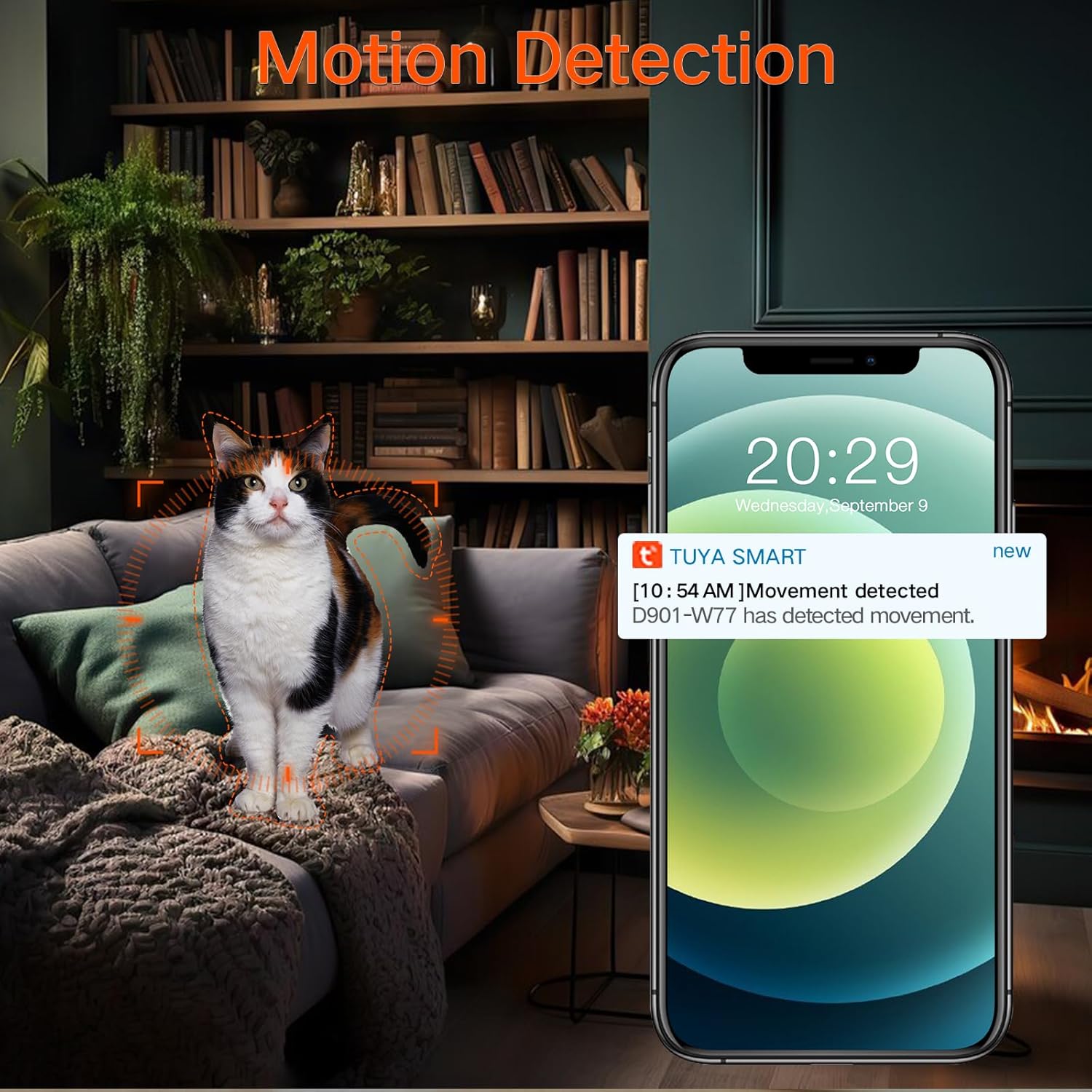 Motion Sensing & Alert Push: Built-in motion sensing device, automatically records when detecting moving objects, and APP will push warning messages.