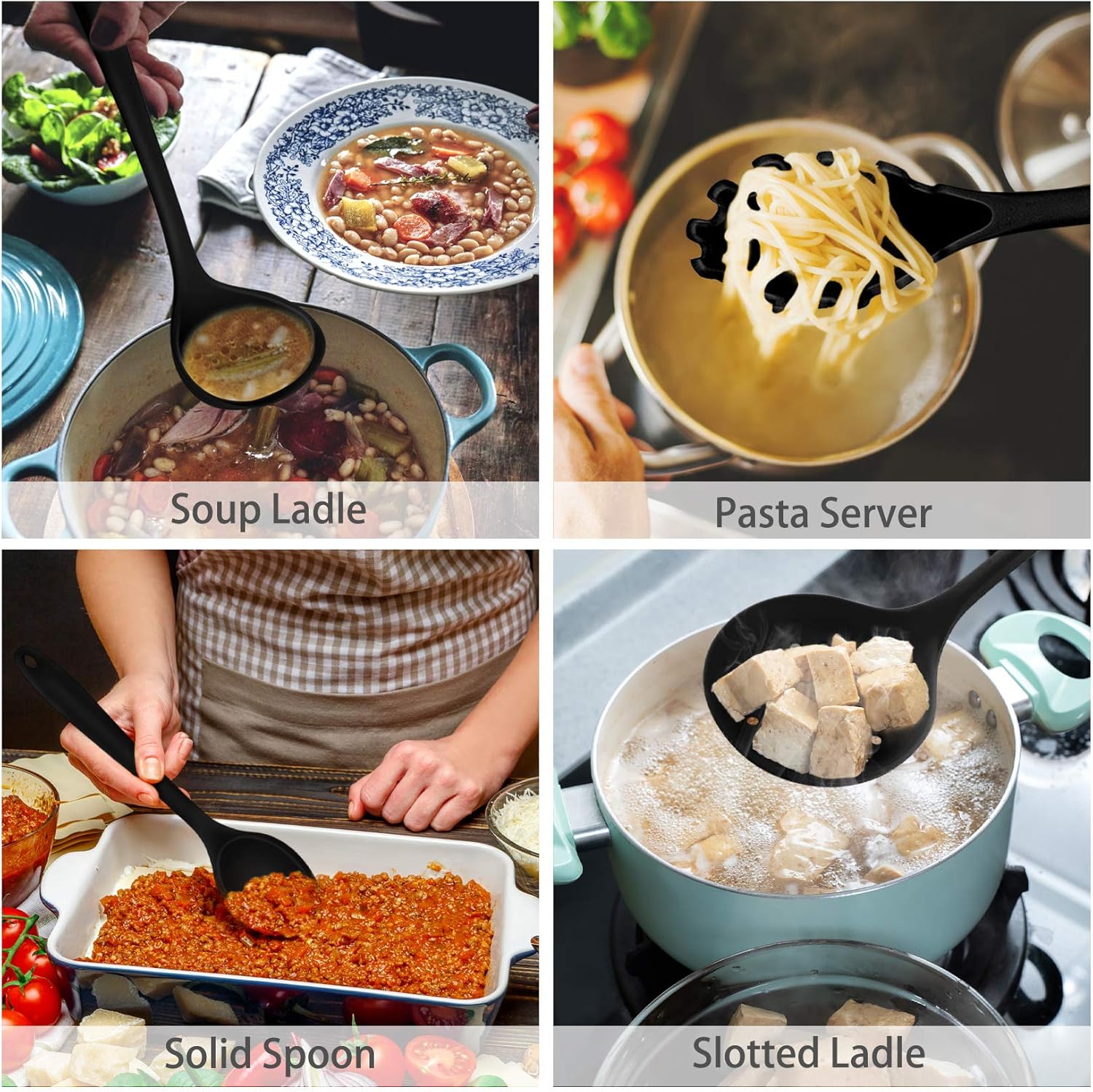 【FOOD GRADED & DURABLE】P&P CHEF Utensils and measuring cups are made of food-graded silicone and plastic, No toxic materials, No peculiar smell, No musty or no chipping, More durable than the wooden, Silicone head could protect your non-stick pan from scratch,Proper maintenance could extend their service life even extend the life of your pots and pans! Black set is classic and popular to join your modern kitchen, To be a good gift choice