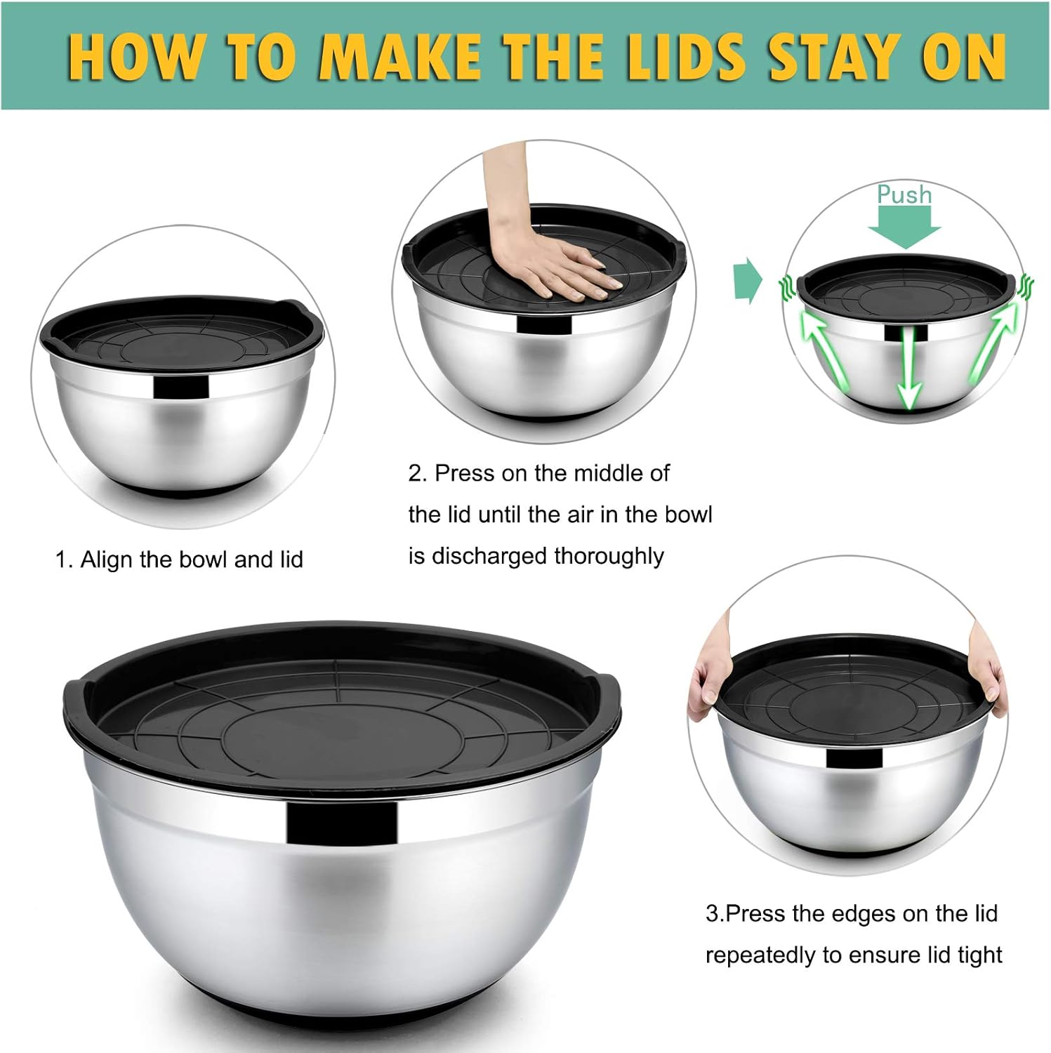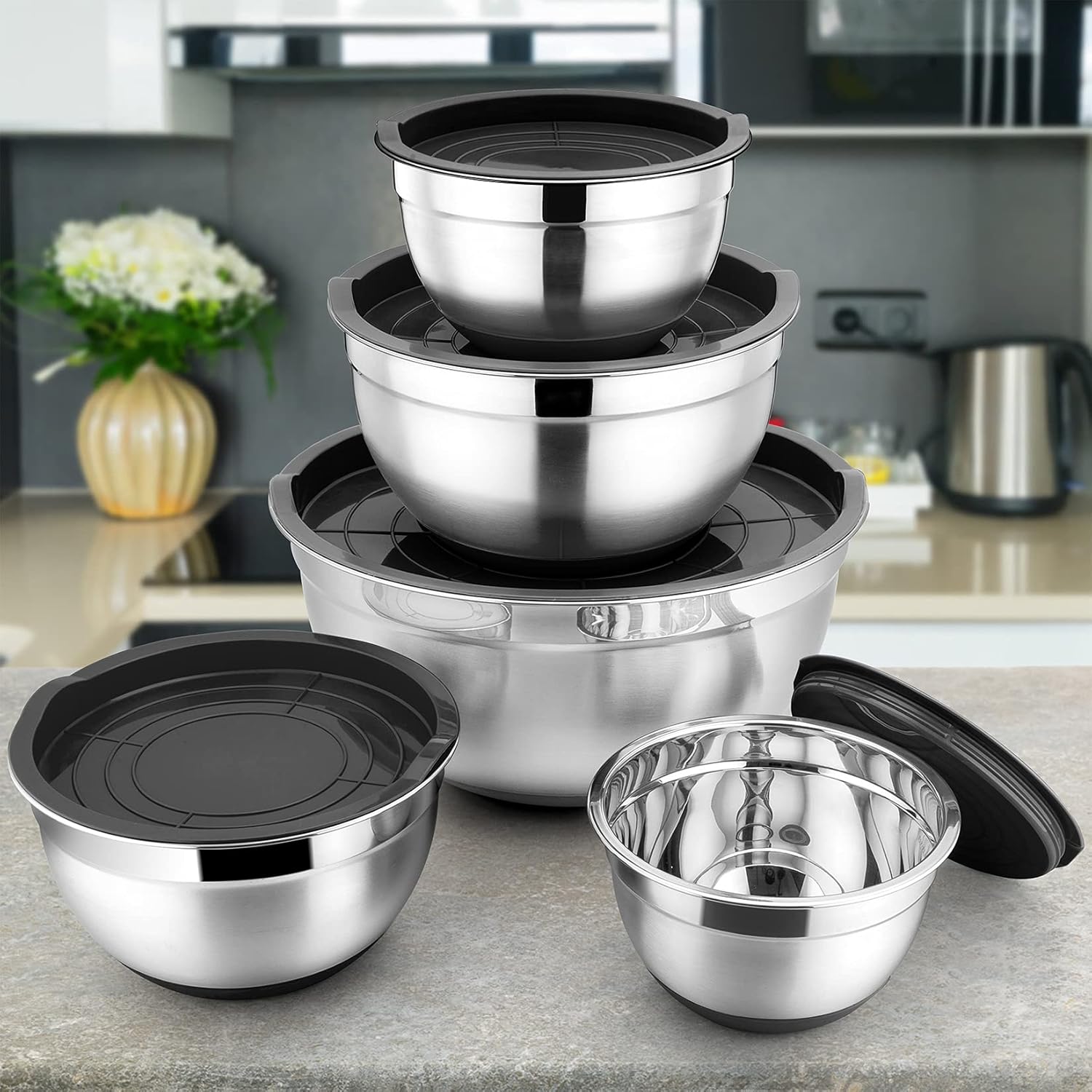 Our mixing bowls come with 5 solid steel bowls and 5 black lids and 1 good-looking package box, they are elegant enough to join into your kitchen. They also is a great gift for housewarming, wedding,birthday and Christmas ect.