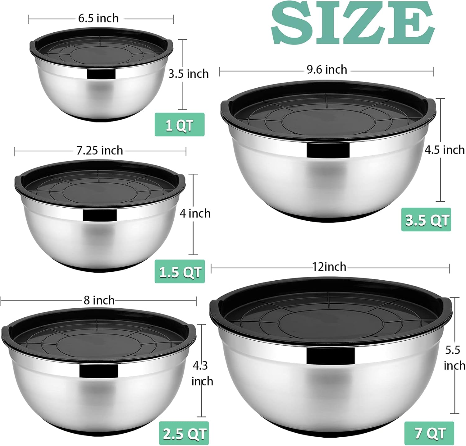 【MULTI USES】This mixing bowl set comes with 1,1.5, 2.5, 3.5, 7 quart, 5 different size bowls have multiple usages on your home kitchen, restaurant and canteen, like prepping food, storing leftover, or mixing salads, beating egg or serving soup, Our bowls are dishwasher safe and lids are recommended hand-wash only