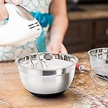 How about P&P CHEF Stainless Steel Mixing Bowls Set of 5? Please focus on the details of these mixing bowls, they would meet your full needs in the kitchen. This kitchen aid stacking bowl set could be a great housewarming gift!