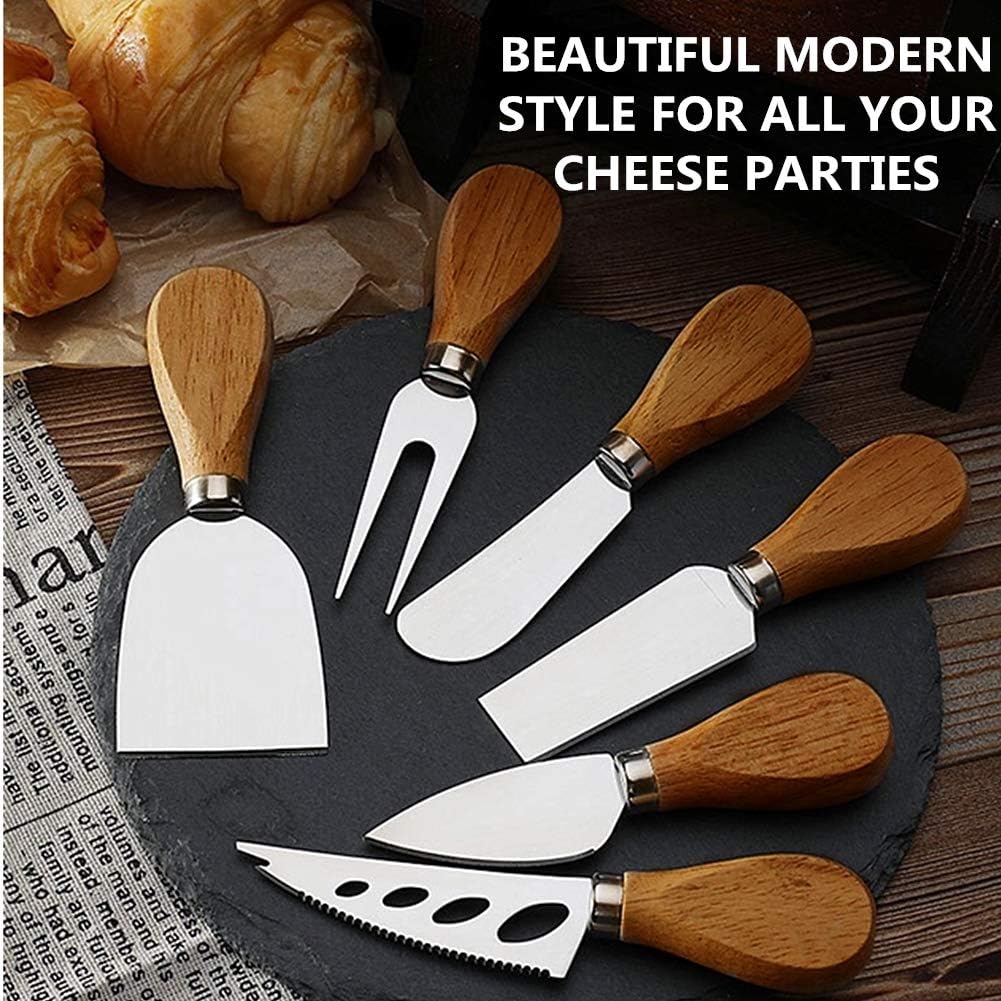 HIGH-CLASS 6-PIECE CHEESE KNIVES SET:This full Cheese Knife Set includes 4 cheese knives, 1 cheese fork and 1 cheese spreader and is everything you need to serve all of your favorite cheeses.The blade is made of food grade stainless steel.Non-Stick, Rust Resistant.