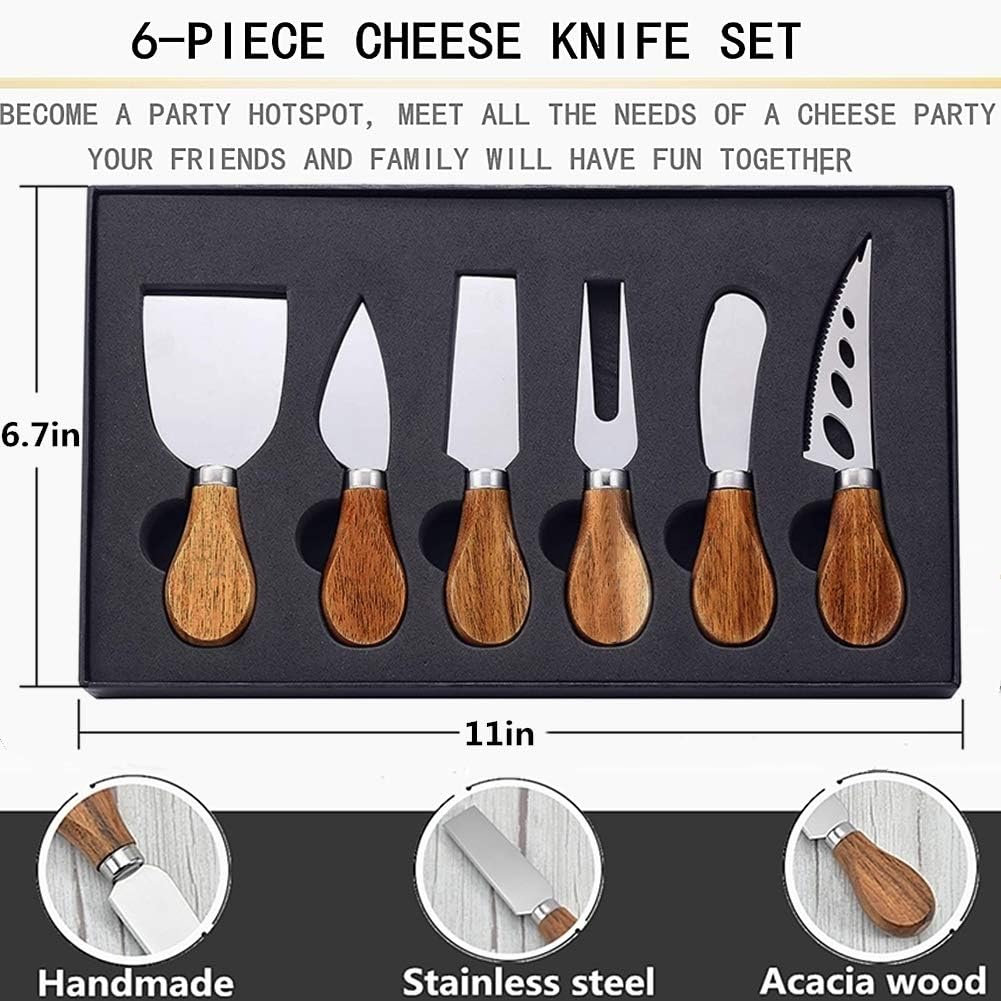 Premium 6-piece setstainless steel cheese knife set is not easy to rust, the handle is made of acacia wood, the quality is very good. Comes with a gift box, lined with velvet sponge, and each cheese knives is inside. This is the perfect gift. For weddings, Mother’s Day, Father’s Day,christmas,housewarming, Thanksgiving and birthdays, this exquisite cheese knife set will be a good choice. Just ask who can refuse such exquisite and advanced charcuterie accessories.