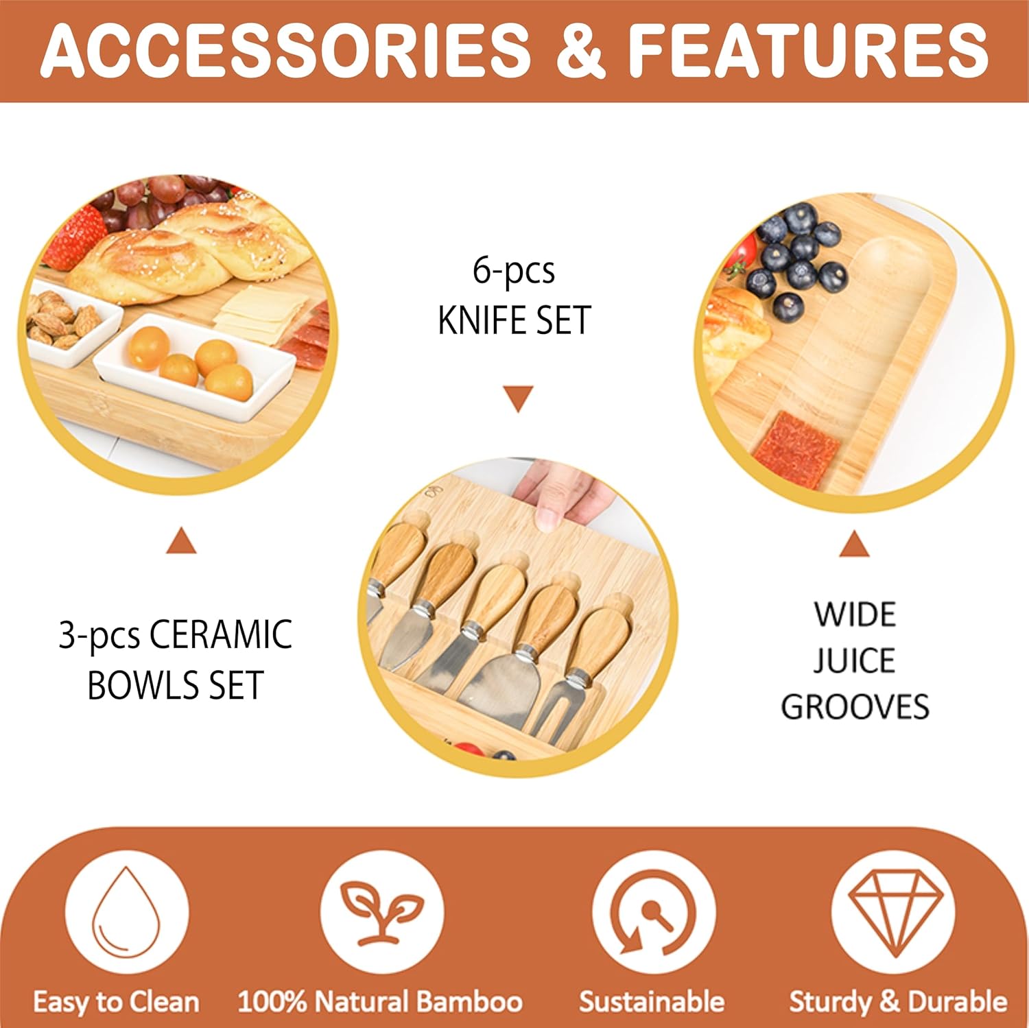 Premium Bamboo Charcuterie Board – Durable, easy to use, easy to clean, and built to last premium bamboo.Multi-Use Design – A cheese board gift set perfect for hosting, holidays, and everyday dining.Perfect for Any Occasion – Use it for a Christmas charcuterie board set, wedding charcuterie board, or housewarming gift.Crafted for Excellence – Made with premium bamboo, this charcuterie wooden board is resistant to stains, odors, and moisture. All-In-One Set – Comes with a cheese board knife set, bowls, and a slide-out storage section.