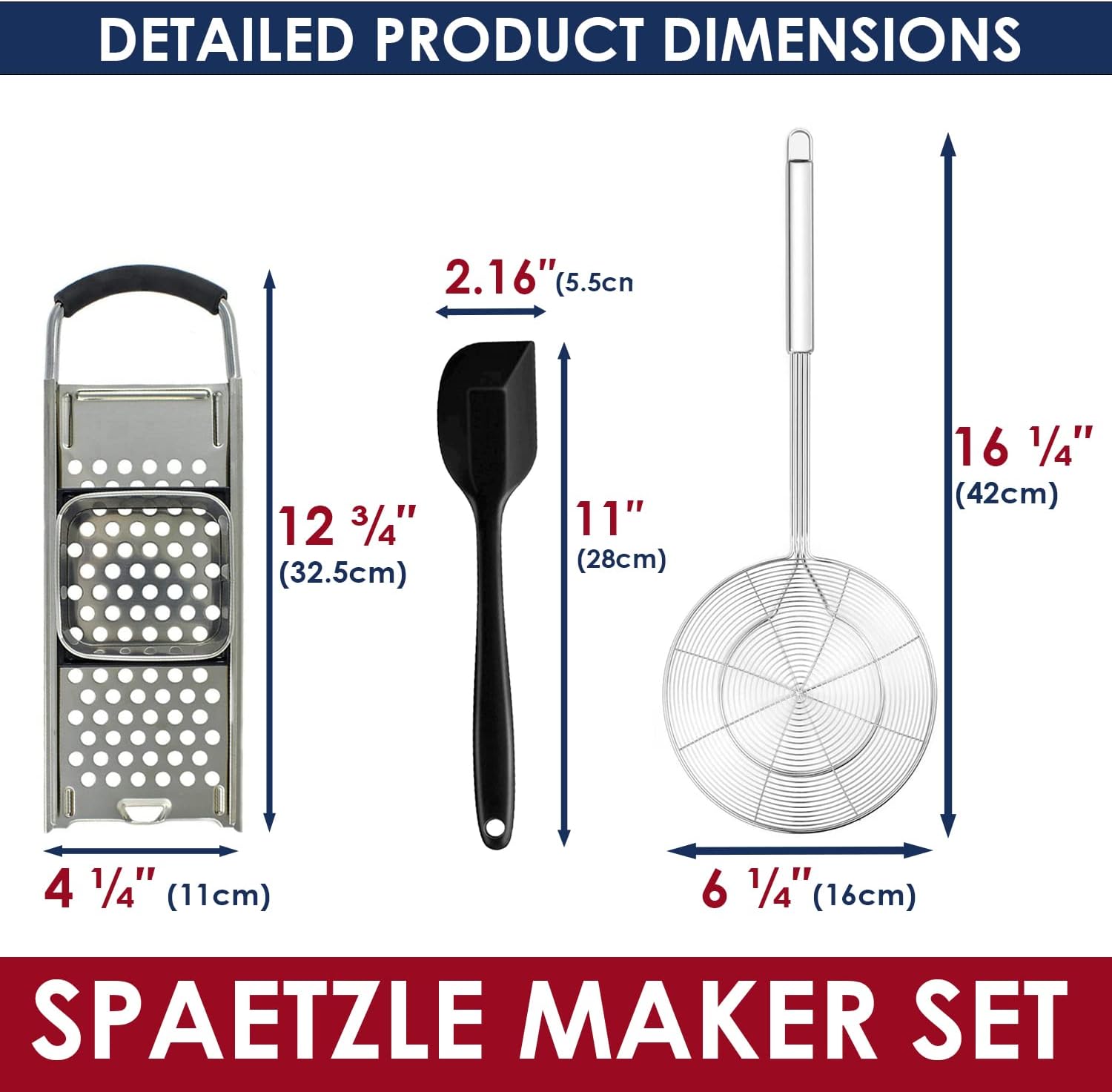 MAKE HOMEMADE SPAETZLE – This KEISSCO Spaetzle Maker and Spider Strainer Set is the easiest way to make beautiful, uniformly sized German noodles at home. A delicious plate of perfectly shaped spaetzle noodles is just a few minutes away with this ingenious handheld stainless steel spaetzle maker set. Now you can look forward to preparing classic spaetzle dishes for your family without the usual hassle and mess!