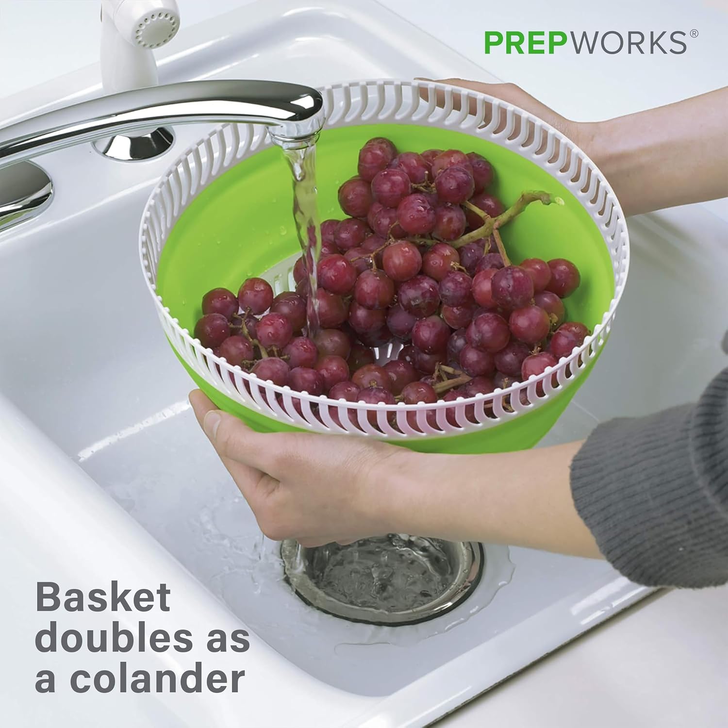 Salad spinners are a great addition to any kitchen but their bulky size can be difficult to store. With the Progressive Collapsible Salad Spinner you can reclaim your cabinets. The innovative designed salad spinner folds down to just under 3, approximately 1/2 its original size, to easily fit just about anywhere. Plus the flat lid makes it possible to stack other items on top. Made of plastic.
