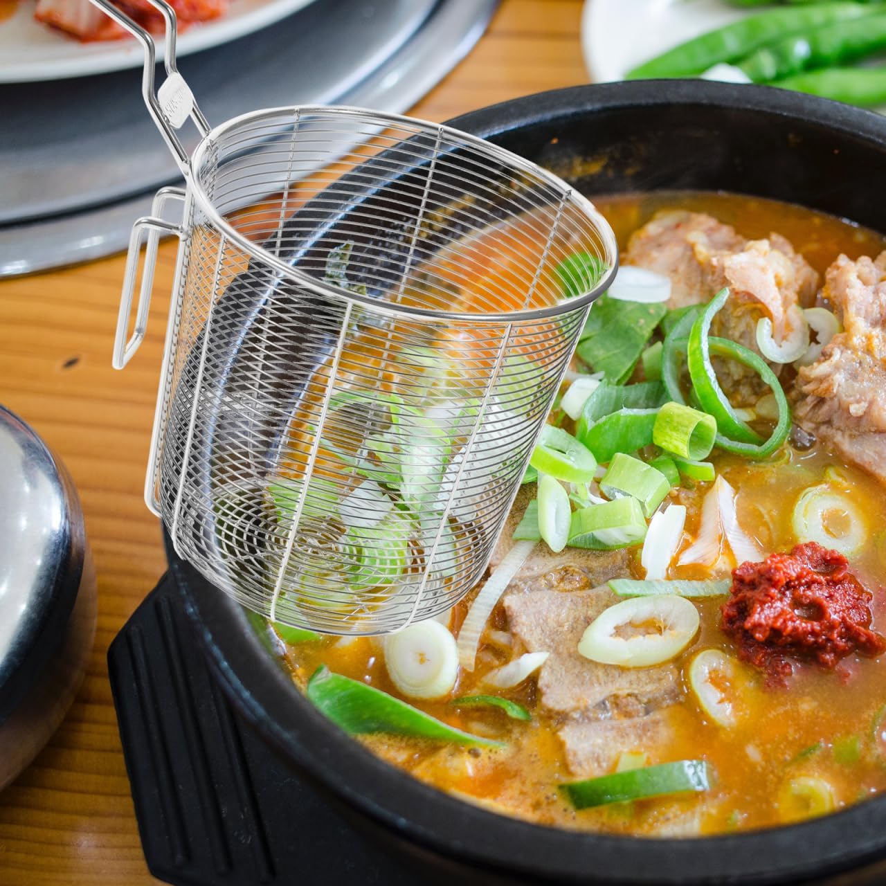 Straining noodles basket: stainless steel frying basket high-class and safe stainless steel material, strong and durable, not easy to deformation. fine grinding, smooth surface, no burr, comfortable feel, easy to use. specially designed for food filtration, easy to use, save time and effort.