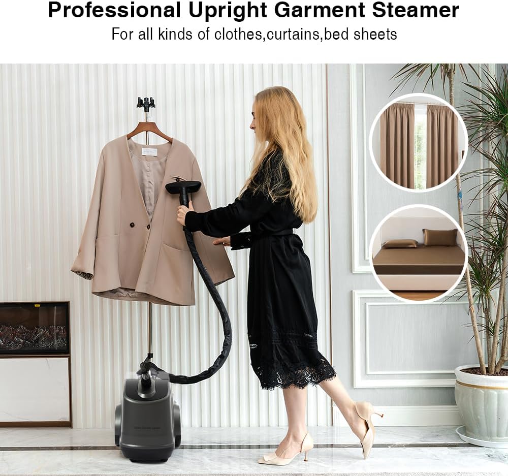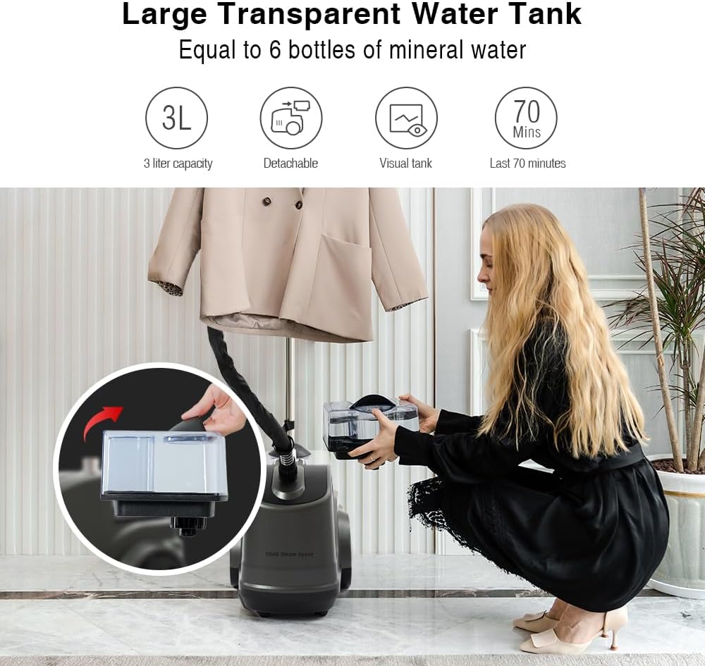 [Convenient Design]: Say goodbye to back pain with our TRAs Steam Space garment steamer, which has a comfortable grip and upright clothing support rods for effortless ironing. Large diameter wheel allows to move easily and realize the whole house ironing.