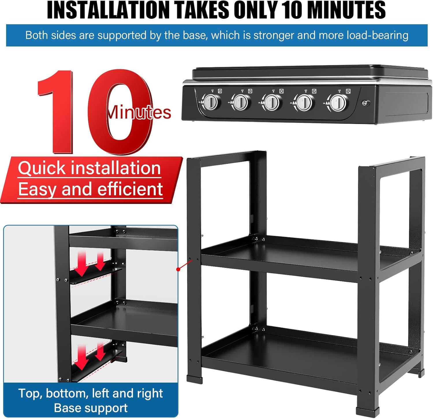 This outdoor stove can be assembled in less than 10 minutes with a removable stand and CSA certified gas regulator and hose for easy use.