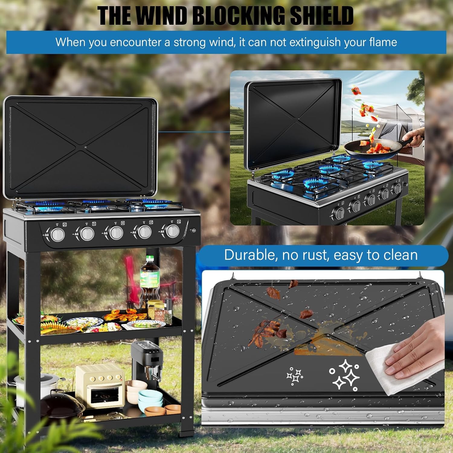 【5-Burner Propane Stove】- This gas cooktop features a heavy-duty steel frame and cast iron burners with a black powder-coated finish that withstands high temperatures and is built to last,With auto ignition, it quickly and evenly heats up food, while also resisting rusting for a long service life.