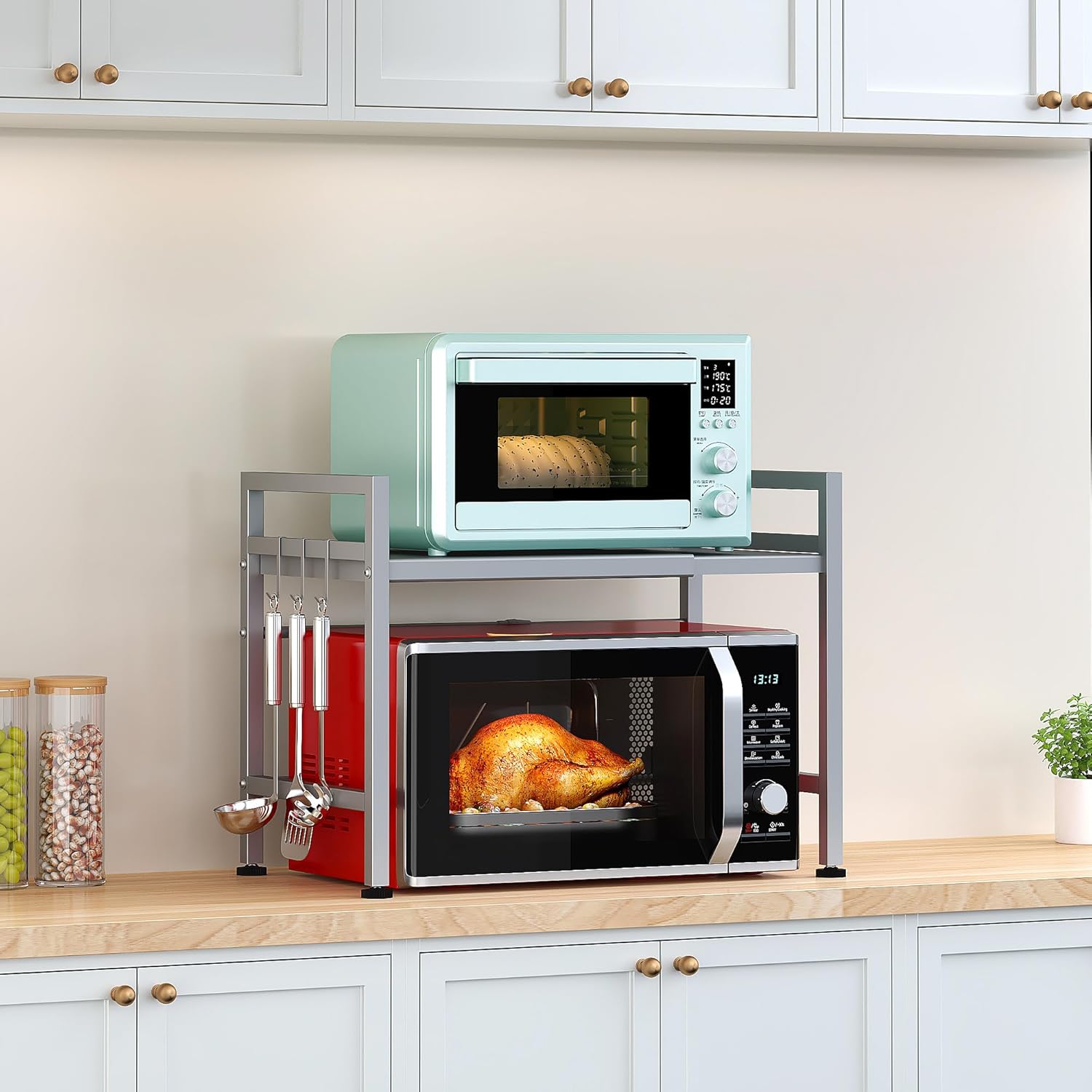 Have you tired of the large microwave carts for kitchen? No worries! Check our premium expandable microwave rack which can be easily adjusted to the right length of your countertop, stylish yet multi-functional. Upgraded Microwave Rack for Kitchen Organizer Pusdon Microwave Oven Rack is thick and heavy duty, featuring high load-bearing capacity and matte painted texture. The extendable design can easily be adjusted to fit different sizes of microwave ovens. There are 4 non-slip suction cups on the bottom to secure the shelf to the table. Equipped with 3 hooks, it can effectively organize kitchen utensils and tidy up your space. STRONG BEARING CAPACITY Due to the use of heavy carbon steel and iron, The Pusdon Microwave Oven Rack has a strong load-bearing capacity. Seasonings, cutlery, dishes and even a microwave can be placed at on the top shelf! RETRACTABLE DESIGN The retractable microwave oven rack provides additional storage space by simply adjusting the bracket. This rack can easily adapt to the size of almost any microwave oven size. BUILT WITH ADVANCED TECHNOLOGY The surface of the microwave oven rack frame is electrostatically sprayed for a smooth matte texture. Underneath the top layer is a five-layer coating, which makes the microwave rack anti-oil, rustproof. Serves the normal demand of the daily use. Get it now to give your lovely kitchen an organized look as soon!