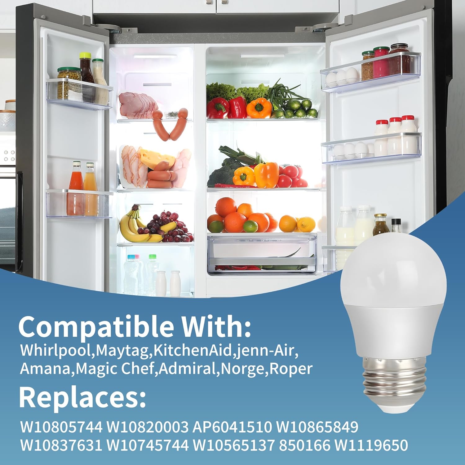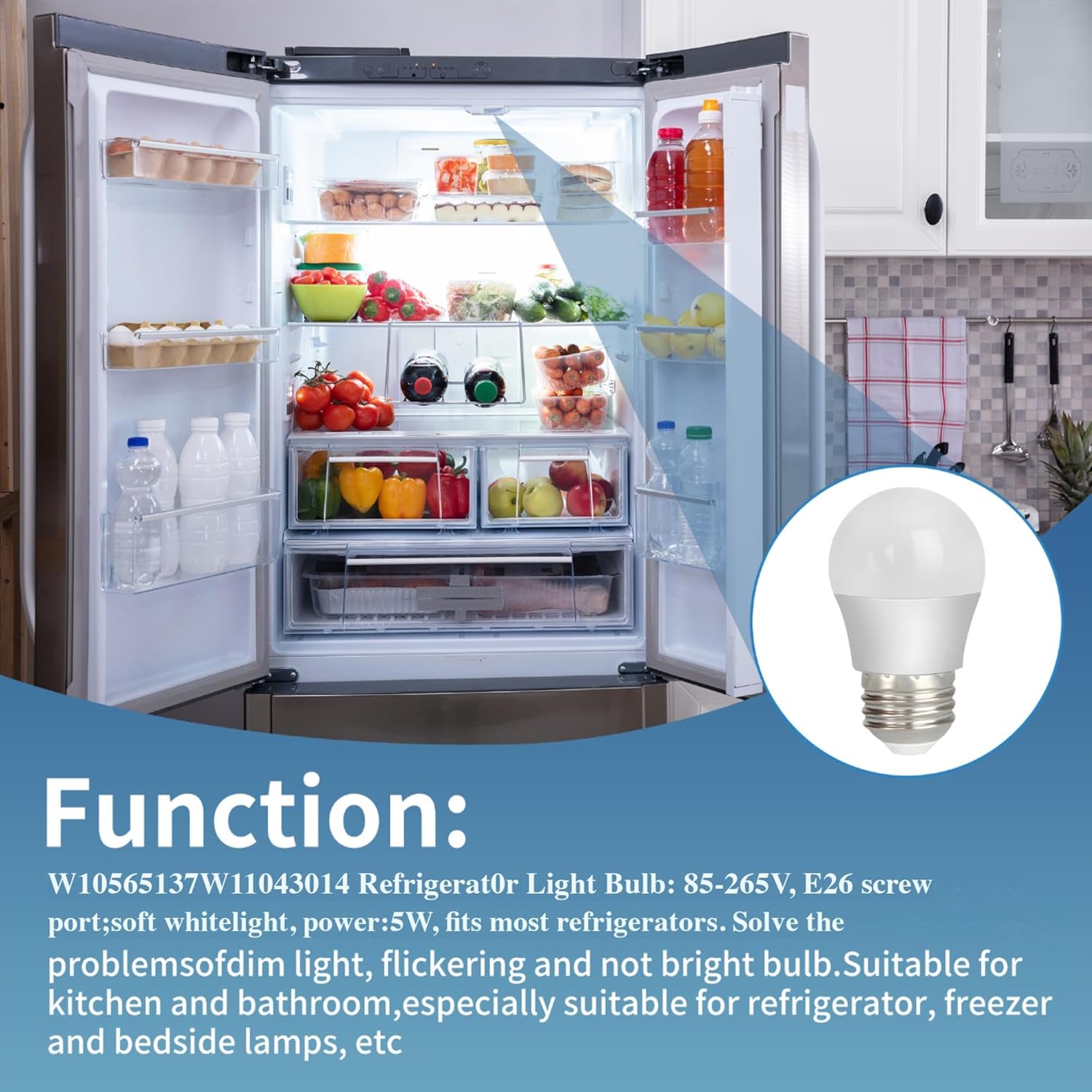 Widely Compatible:W11043014 W10745744 freezer light bulb for refrigerators compatible with Whirlpool,Maytag,KitchenAid,Jenn-Air,Amana,Magic Chef,Admiral,Norge,Roper,and others.Refrigerator LED Light Bulb replace W10805744 W10820003 AP6041510 W10865849 W10837631 W10745744 W10565137 850166 W11196500 W11338583