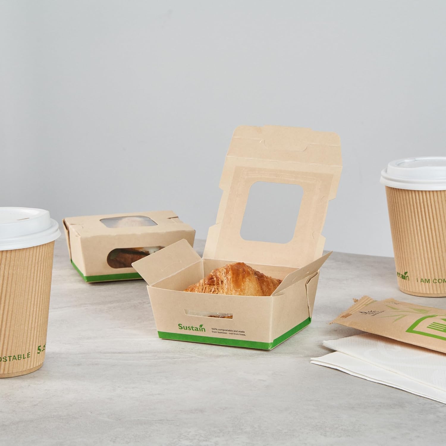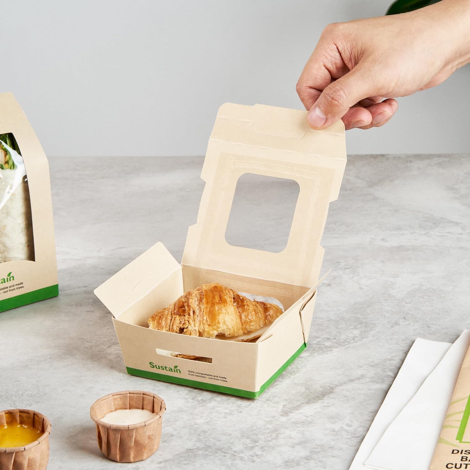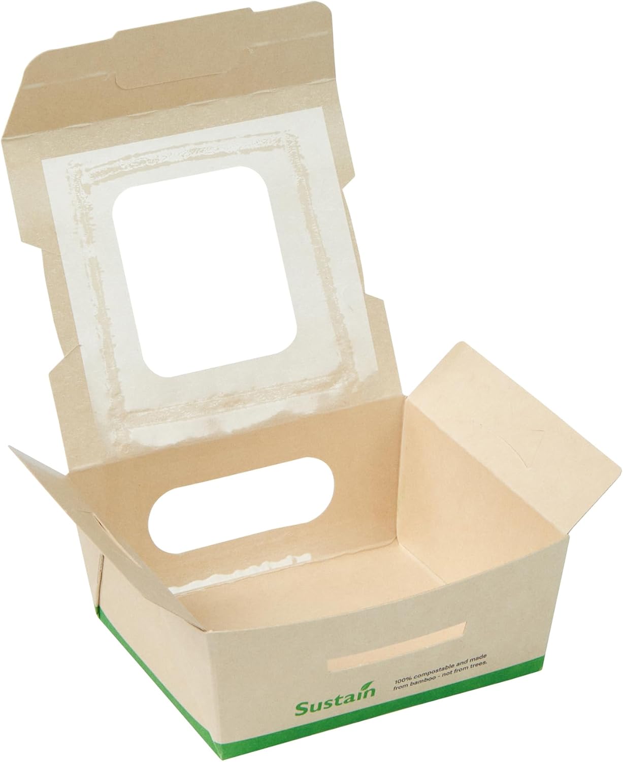 Serve your hot or cold meals with our Sustain 12-ounce Bamboo Paper Mini Bio Lunch Boxes. Crafted from sturdy bamboo paper, these bamboo food containers are designed to hold up under the weight of hefty meals. With the PLA lining feature, these disposable take out containers are commercially compostable. The clear PLA windows on the top and side of these mini paper containers minimize errors by letting you see the contents inside With a greaseproof feature, these paper lunch boxes provide a barrier against grease and liquids, ensuring your food stays fresh and appetizing. Plus, with a tab-lock design, these salad containers secure your meals, avoiding spills and messes during transport. Sporting a neutral finish, these disposable food containers provide a simple yet elegant presentation for your take out meals. These takeaway containers offer a generous capacity of 12 ounces, perfect for a main meal or a generous side, and measure 4.3 inches in length by 3.7 inches in width by 1.8 inches in height, making these take out containers a compact solution for your foodservice needs. Shipped flat in a 200 count box.
