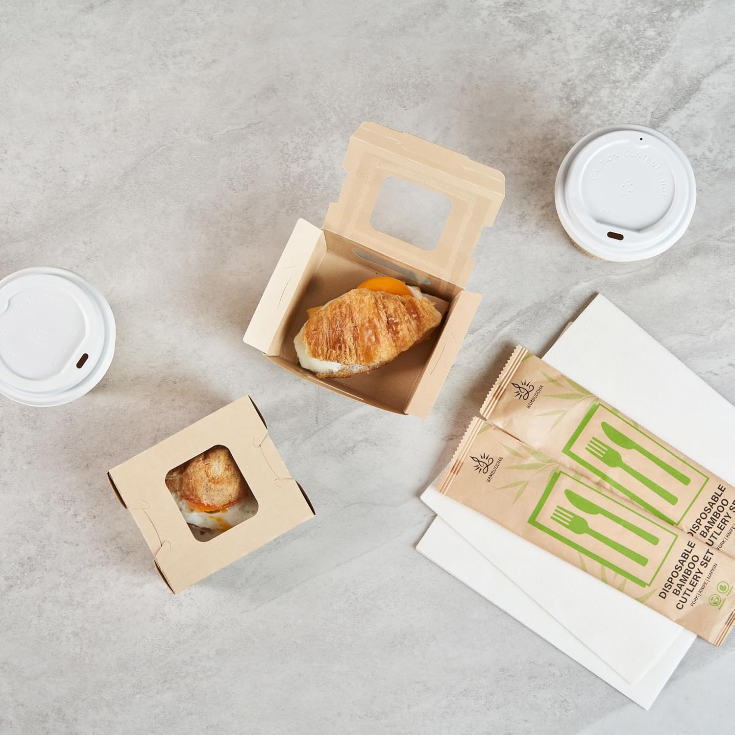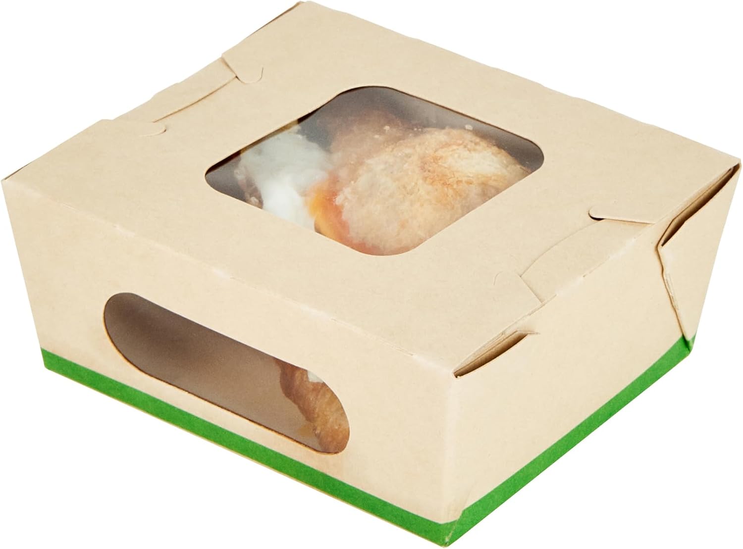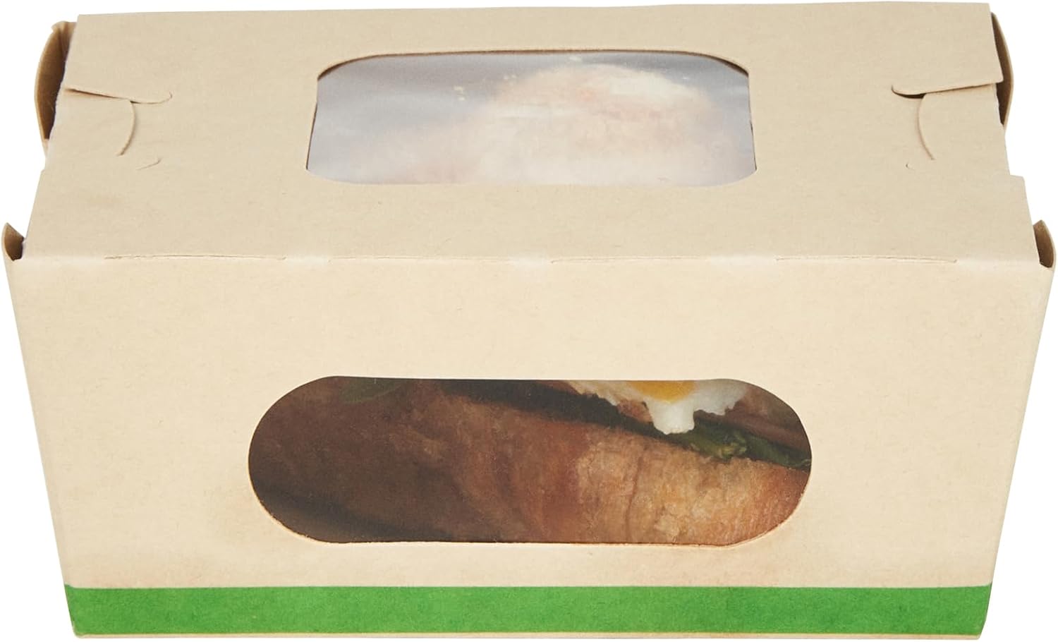 Serve your hot or cold meals with our Sustain 12-ounce Bamboo Paper Mini Bio Lunch Boxes. Crafted from sturdy bamboo paper, these bamboo food containers are designed to hold up under the weight of hefty meals. With the PLA lining feature, these disposable take out containers are commercially compostable. The clear PLA windows on the top and side of these mini paper containers minimize errors by letting you see the contents inside With a greaseproof feature, these paper lunch boxes provide a barrier against grease and liquids, ensuring your food stays fresh and appetizing. Plus, with a tab-lock design, these salad containers secure your meals, avoiding spills and messes during transport. Sporting a neutral finish, these disposable food containers provide a simple yet elegant presentation for your take out meals. These takeaway containers offer a generous capacity of 12 ounces, perfect for a main meal or a generous side, and measure 4.3 inches in length by 3.7 inches in width by 1.8 inches in height, making these take out containers a compact solution for your foodservice needs. Shipped flat in a 200 count box.