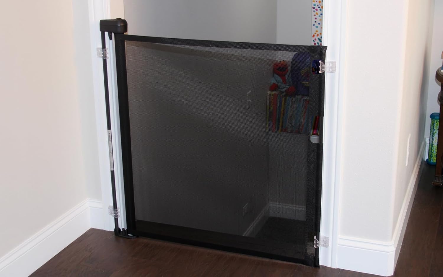 Retract-A-Gate is certified annually by the JPMA to ensure it complies with North American safety gate standards for children 6-24 months. The mesh fabric is a non-toxic reinforced polymer composite. It does NOT contain any material defined as hazardous by the Consumer Products Safety Commission.Retract-A-Gate’s mesh remains flexible so it can rewind into the reel. However, the mesh is taut enough to prevent a child from squeezing under when installed correctly. Here are some tips: