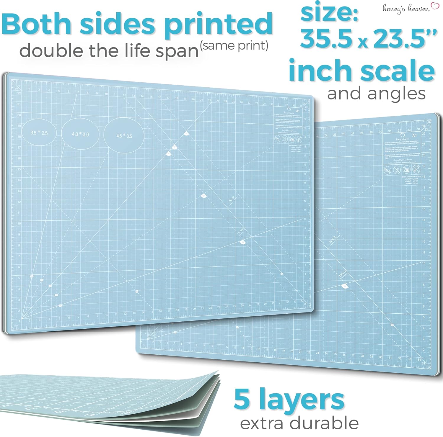 Self Healing Cutting Mat included. Double sided design, made from durable 5-Ply material for accurate cutting. Cutting Mat size is 35.5″ x 23.5″ (A1), Grid size of print is 35″ x 23″, thickness is 3 mm.