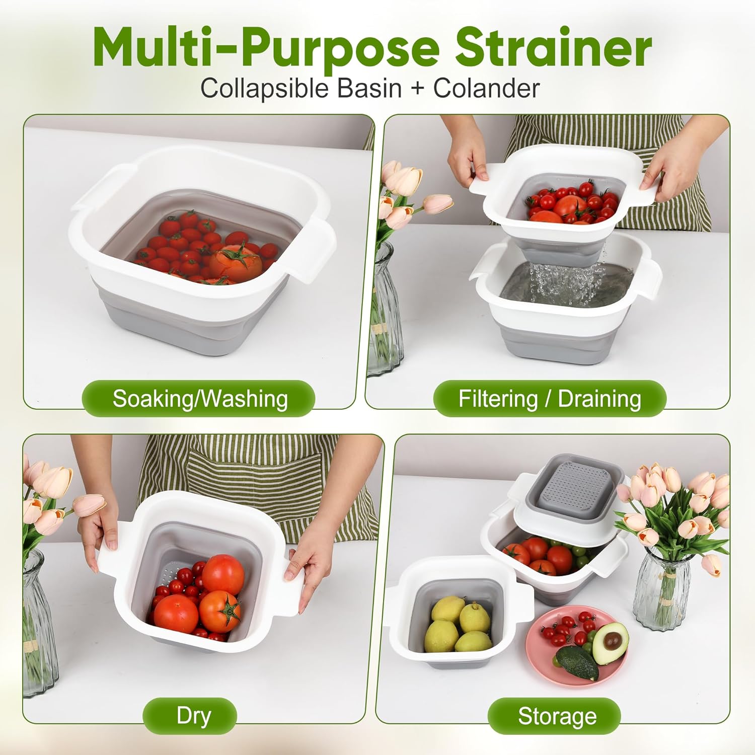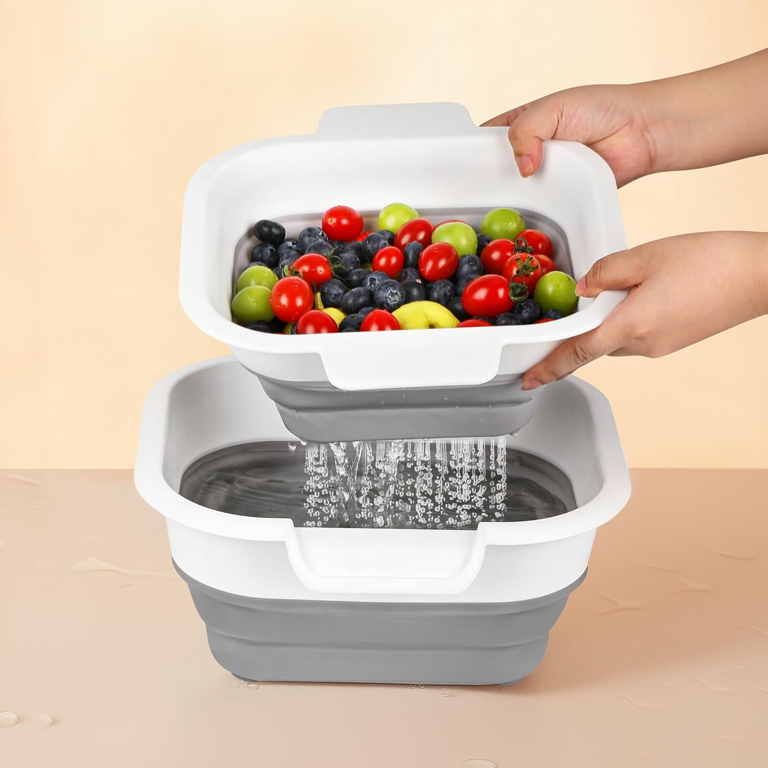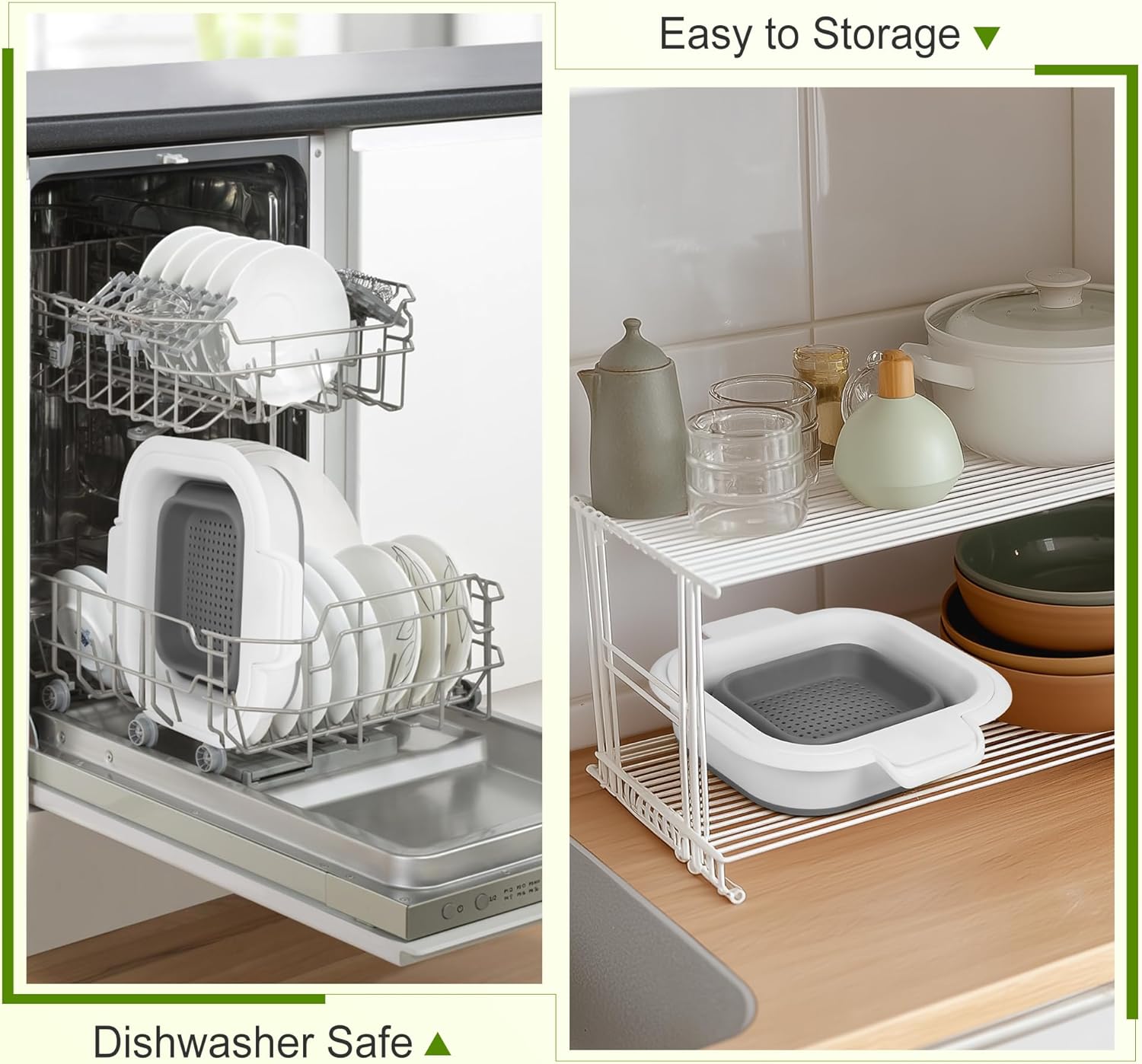 2 in 1 Collapsible Colander – Rottogoon’s colander strainer basket set of 2 contains a basket and a colander. Get the versatility with this strainer bowl and colander set. Use them together for a convenient straining solution, or use them separately for unique kitchen tasks. A 3 qt colander is suitable for rinsing or draining vegetables and fruits or thawing frozen food. A 5 qt bowl can be them as a basket on your countertop and soaking food.