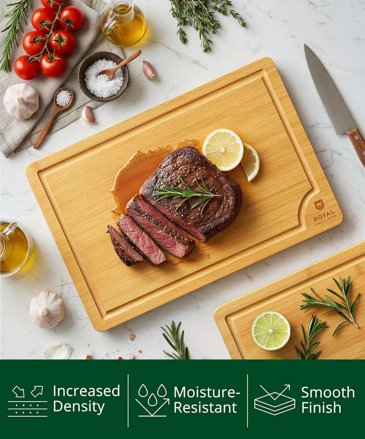 𝐑𝐄𝐋𝐈𝐀𝐁𝐋𝐄, 𝐒𝐀𝐅𝐄 𝐂𝐔𝐓𝐓𝐈𝐍𝐆 𝐒𝐔𝐑𝐅𝐀𝐂𝐄: Combine the art of meal prep and chopping into one with our bamboo cutting board set. Made of minimally refined, high quality natural bamboo material for a durable surface that’ll last for years of cooking, these are the optimal cutting boards for kitchen use. Our lacquered wood makes for a non-porous surface that is scar, scratch, stain, and scrape resistant, so your wooden carving board butcher block set is up for any task, the ultimate everyday kitchen gadget.