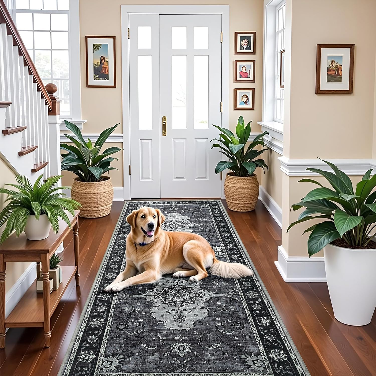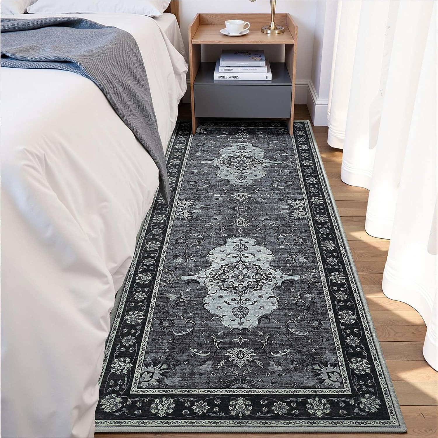Runner Rug for Hallways Kitchen Rugs Non Slip 2×6 Washable Rugs with Rubber Backing Water Repellent Floor Carpet Low Pile Soft Floral Carpet for, Laundry, Bedroom, Bathroom Black/Grey