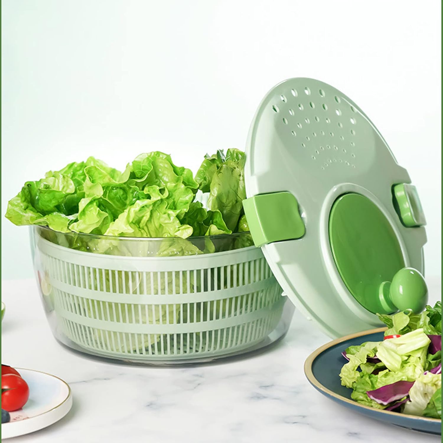 Save time and effort: Simply the large handle of the lettuces to and dry the salad vegetables in few seconds, allowing you to make multiple salads at once, saving time and effort.