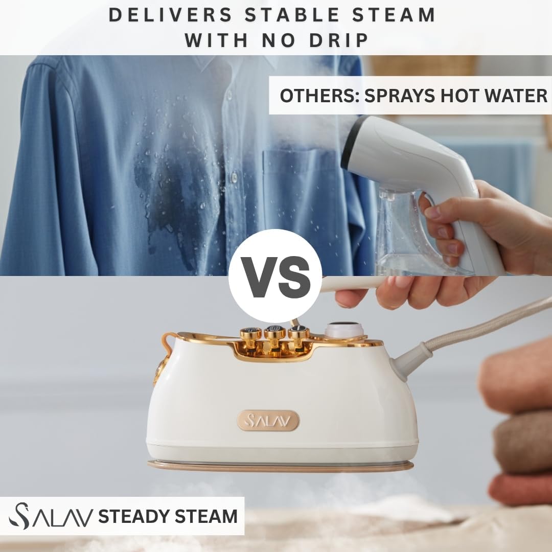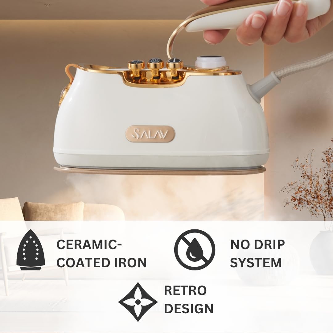 SALAV® Retro Edition Duopress Handheld Garment Steamer and Iron, Ceramic Plate, 1000 watts of Steam, Removes Wrinkles on Clothes, Vintage Style No Drip Steam, Pearl