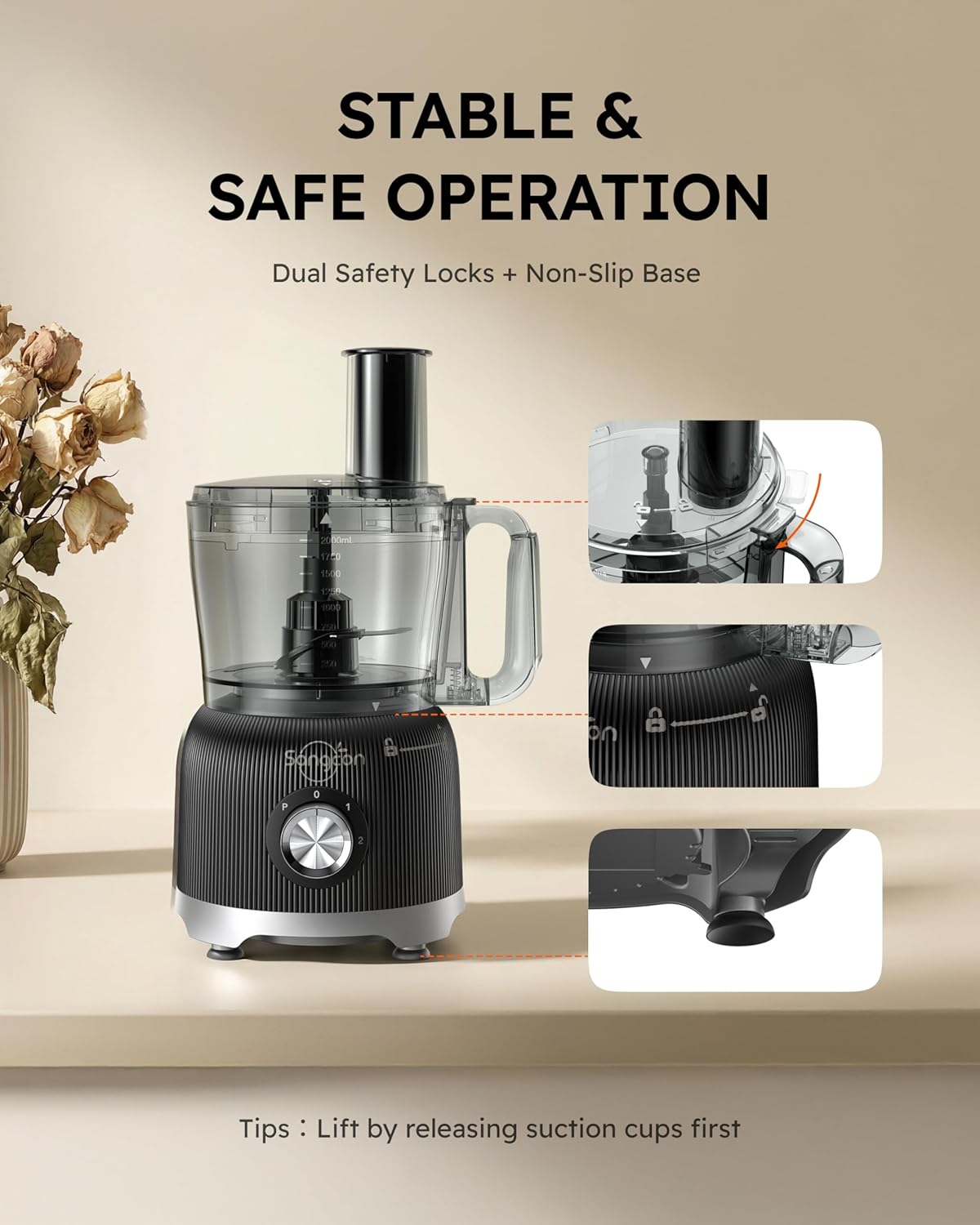 Built for Safety & Stability — Double Lock System + Suction-Cup Base. The processor only runs when the bowl and lid are locked into place, so there are no accidental starts. Four strong suction cups keep the base from moving while in use, even at high speed. Simply lift gently to release the suction after use. A safe, steady design that’s great for busy kitchens, new cooks, and families with kids