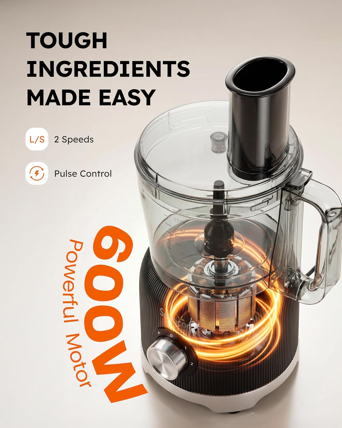 600W Powerful Motor — One Machine, All Your Prep Work Done. This SANGCON food processor is your all-in-one kitchen system for everyday cooking. It handles chopping, mincing, pureeing, slicing, shredding, kneading dough, whipping egg whites, grinding, blending, and salad spinning in one compact unit. The upgraded 600W motor delivers serious power for meat, hard cheese, potatoes, and frozen ingredients—perfect for family meals, weekly meal prep, baby food, sauces, smoothies, and more