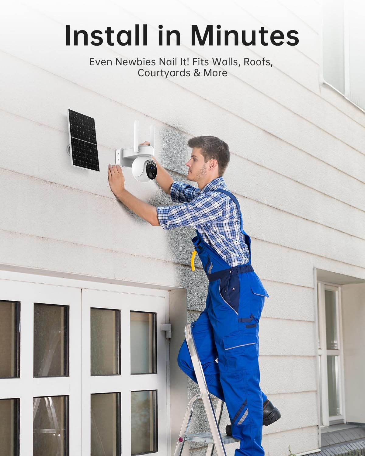 Install in Minutes, Built for Any Weather: Your complete home security solution is just minutes away. This outdoor camera wireless can be mounted anywhere on a wall, under eaves, or in the backyard. Built with IP66 waterproofing and fire-resistant ABS materials, this rugged solar camera operates reliably in any condition, from -4°F to 122°F, ensuring year round protection