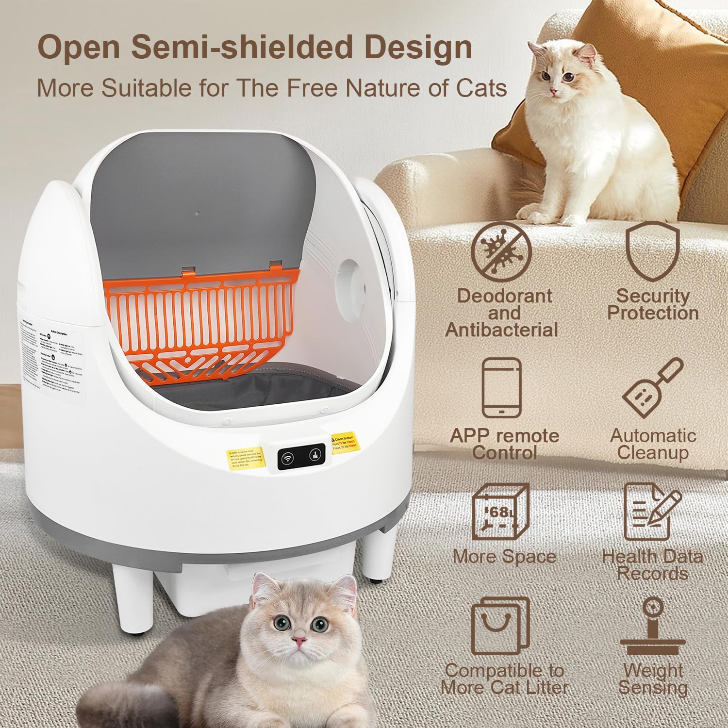 Self Cleaning Cat Litter Box, Open-Top Automatic Cat Litter Box for Multiple Cats, with Safety Protection, Smart App Control, Odor-Free, Removable Washable Liner