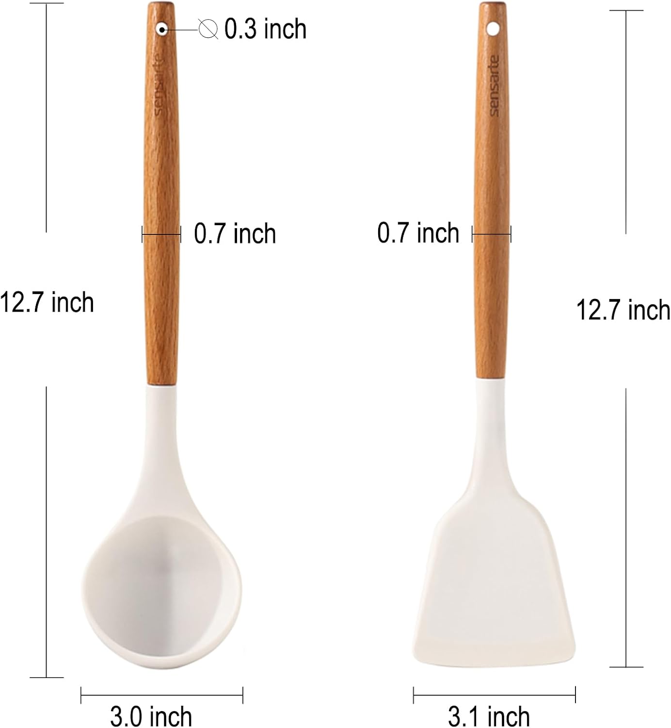 Package Includes: A slilicone spatula with wood handle and a silicone ladle with wood handle.