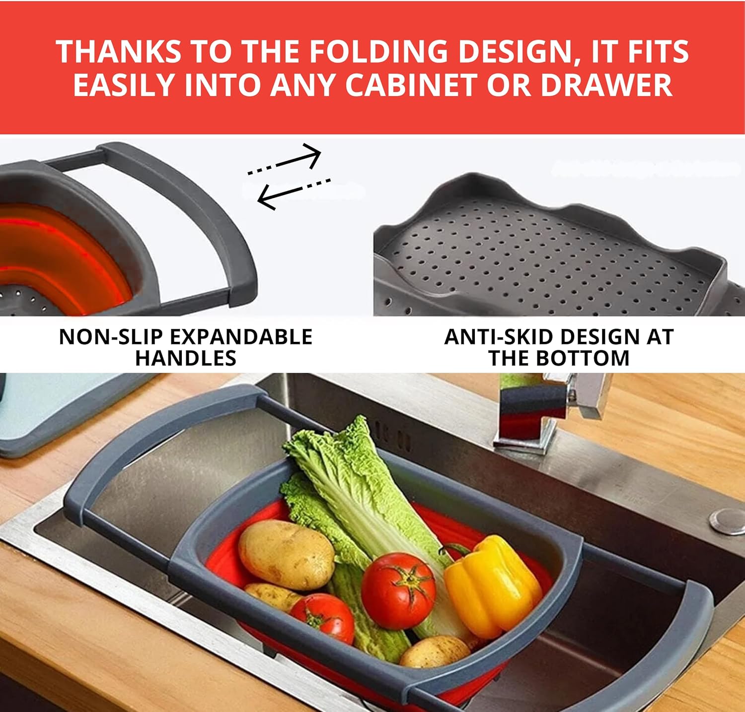 Dimensions: Round colapsable strainer is 11.53” x 9.48”, squish collapsible colander with handle is 13.38” x 7.75”, square collapsible collander is 15.15” x 10.15” folded and 23.70” x 10.15” unfolded. This multifunctional silicone strainer collapsible set is designed to quickly drain water without losing any foods, making multifunctional colander for kitchen collapsible an essential tool