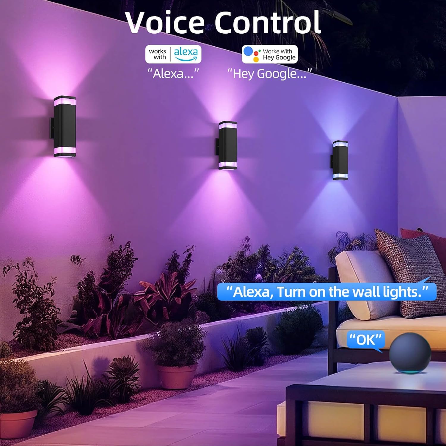 Wi-Fi Smart RGB Outdoor Wall Light – This smart outdoor wall light integrates Wi-Fi, Bluetooth, and remote control for seamless operation. Switch colors, adjust brightness, or activate scenes directly from your phone or via voice commands using Alexa or Google Assistant. Customize lighting for every moment—from casual evenings to vibrant holiday displays.