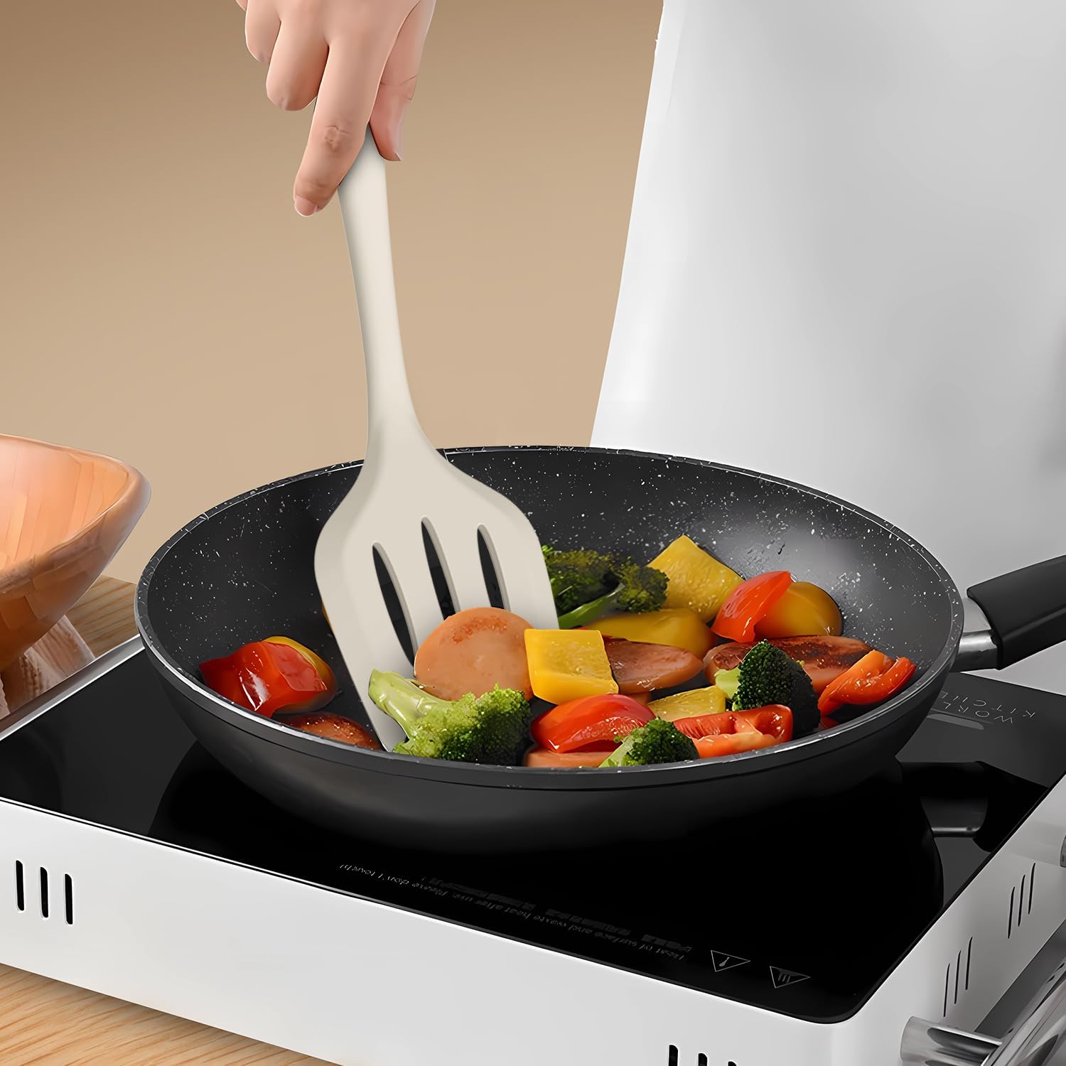 Nonstick Cookware Friendly: The thickened silicone head of this silicone kitchen utensils set is soft and elastic; ideal for silicone utensils for cooking with nonstick pans; makes close contact with the pan surface without scratching the nonstick coating; thus extending the pan’s service life; the silicone handle with moderate size offers a comfortable grip and blocks heat transfer; making it easy to flip; strain dishes or serve soup