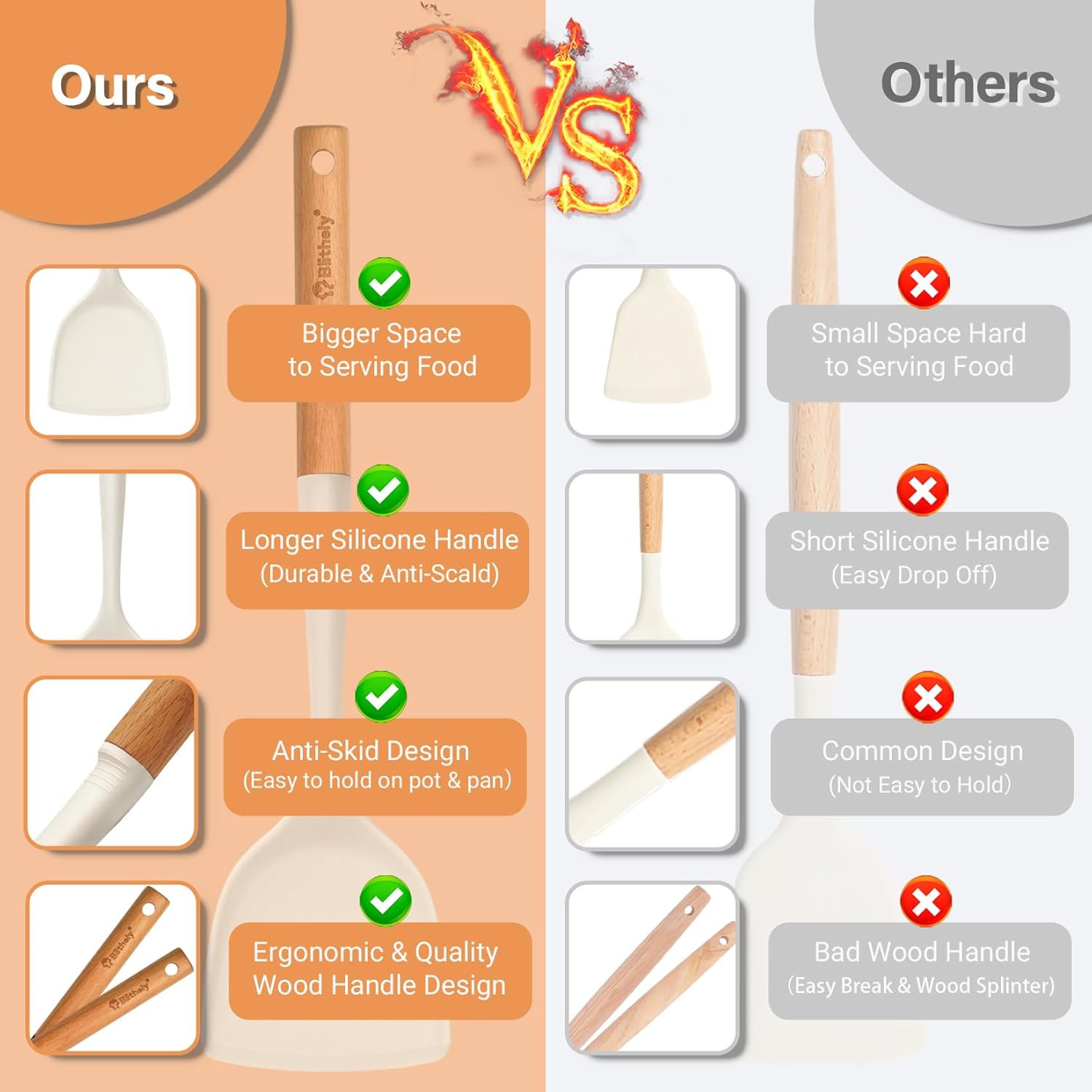 🏆【Easy to Clean & Attention】Our silicone utensil set have smooth surface which is easy to clean. Attention: This product comes with a natural wood handle. Please do not soak it in water for a long time or use a dishwasher. Avoid using a hard or abrasive dishwashing brush to clean the wooden handle. It is recommended to clean it by hand with clean water or gently wipe it with a soft cloth. Make sure the wooden handle is completely dry before storage.