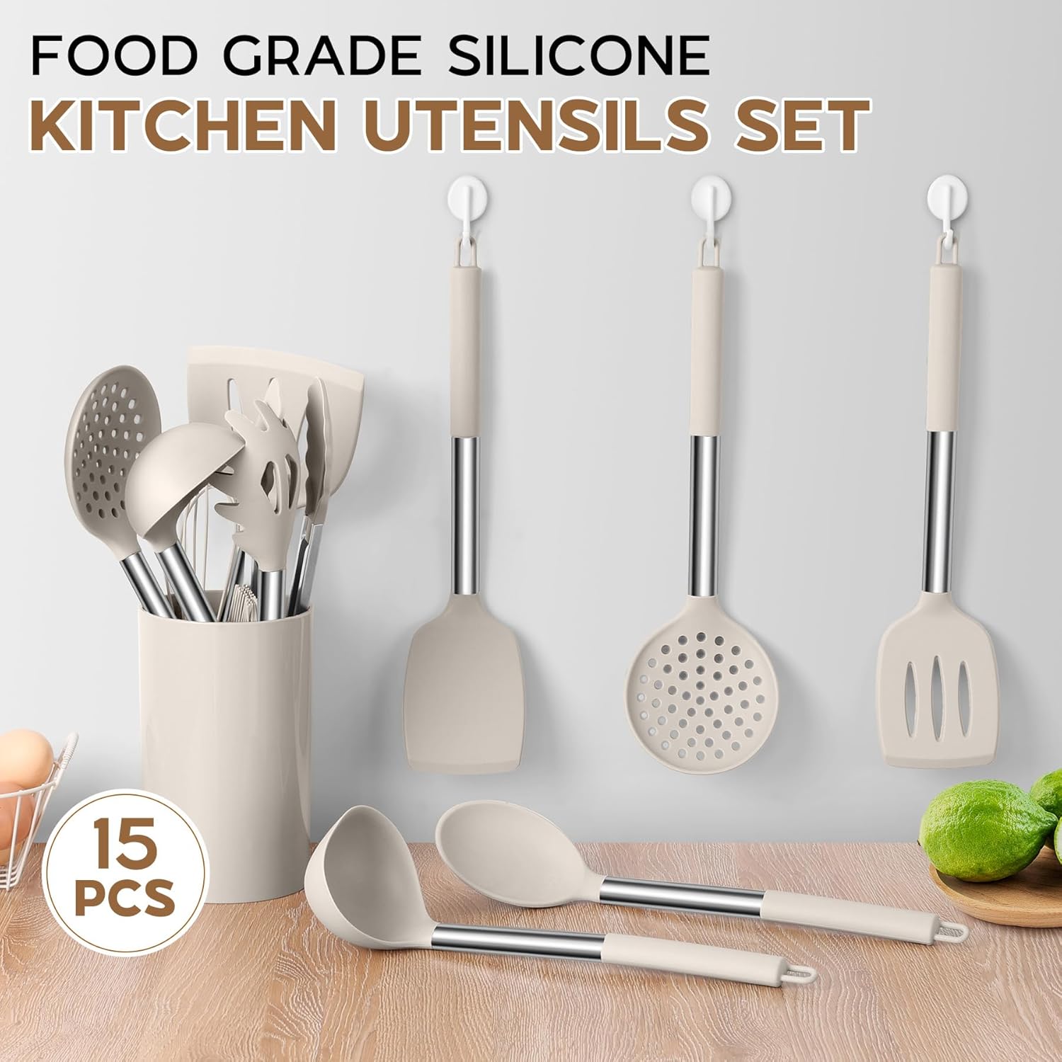 Kitchen Utensils Set With Holder: 15pcs professional silicone cooking utensil set includes slotted turner, solid turner, slotted spatula, slotted spoon, serving spoon, skimmer, pasta server, deep soup ladle, large spatula, whisk, tong, spreader spatula, spoon spatula, brush and utensils holder, meet your all kinds of kitchen needs