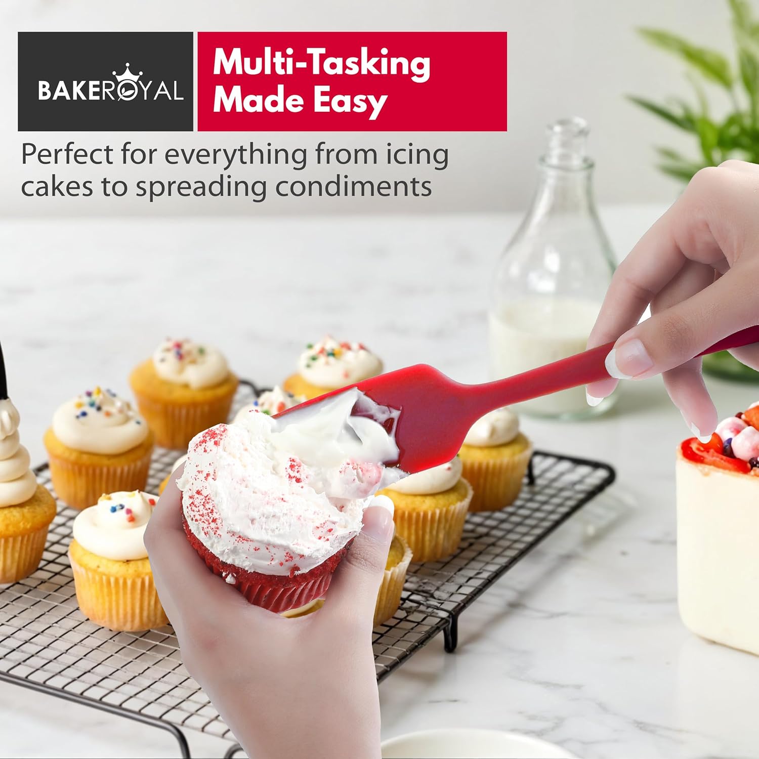 ROYAL TASTE MAKER: This Bake Royal rubber spatula set includes Large, Mini, Spoon, and Jar are the best minimalist kitchen essentials that come with every spatula a new or experienced baker could need to whip up some delicious food. From frosting cakes, scraping batter, Heavy sticky and soft mixing, butter icing, flipping pancakes, scooping dough, to getting the last bit out of the jar done with these well-balanced, functional, and stylish tools that also add a pop of color to your kitchen.